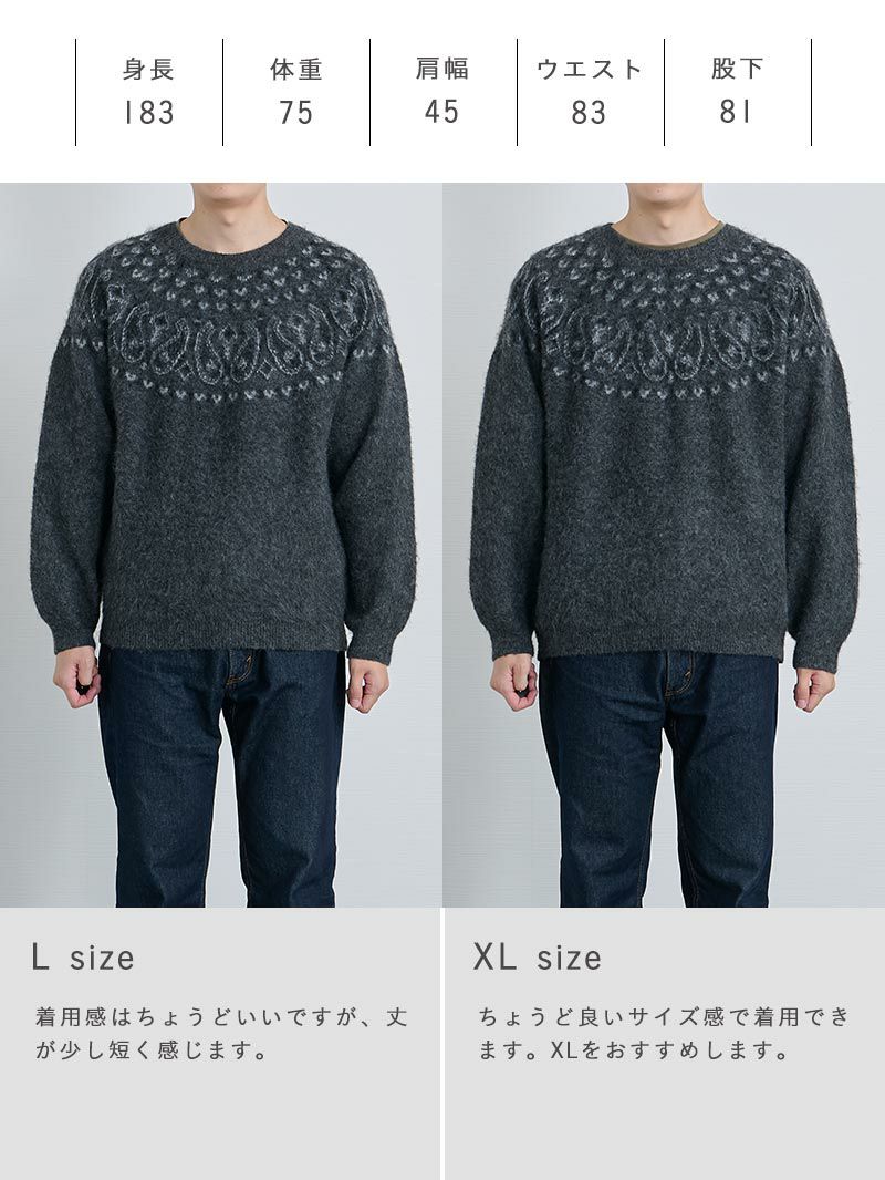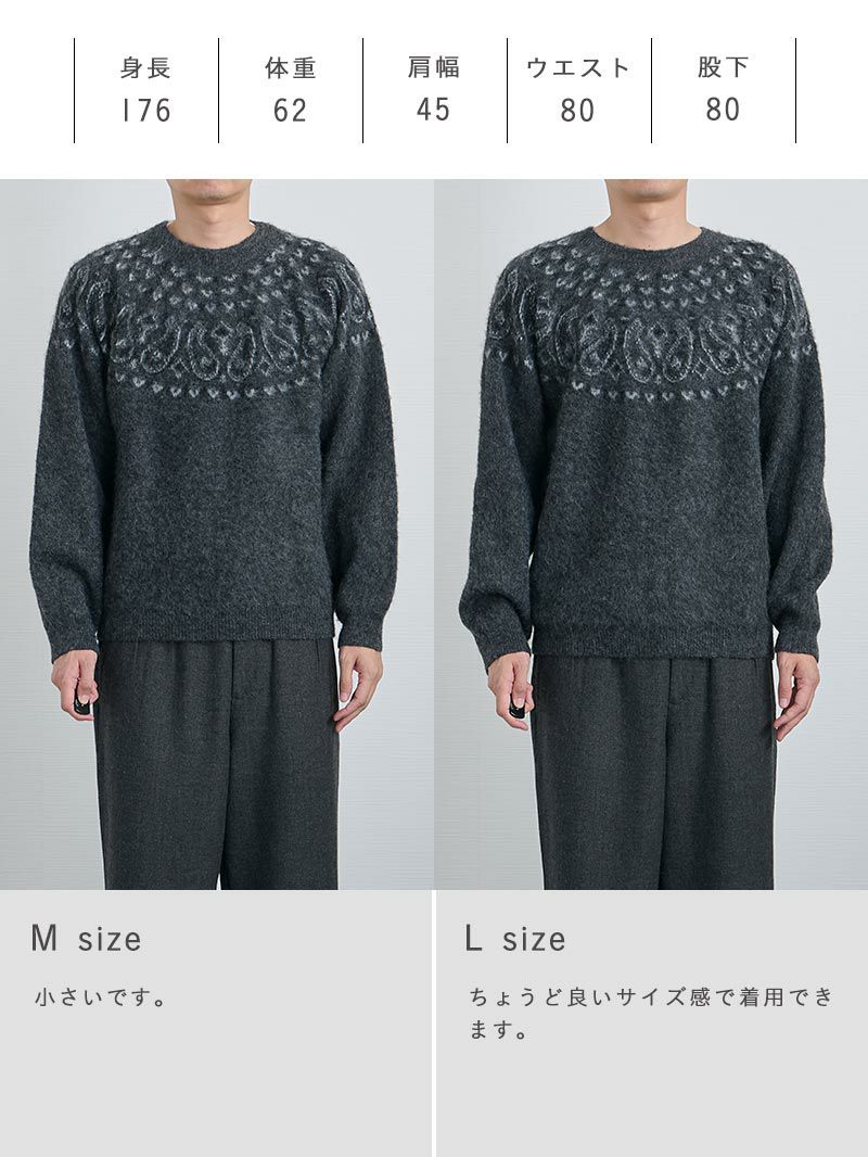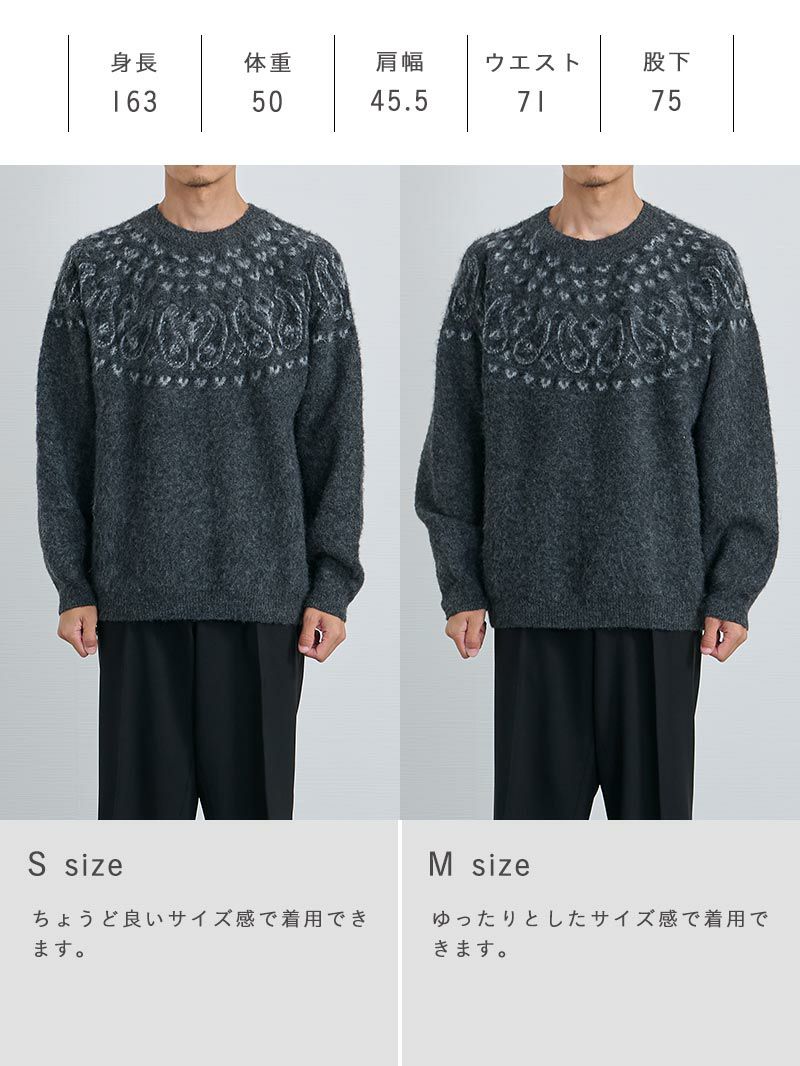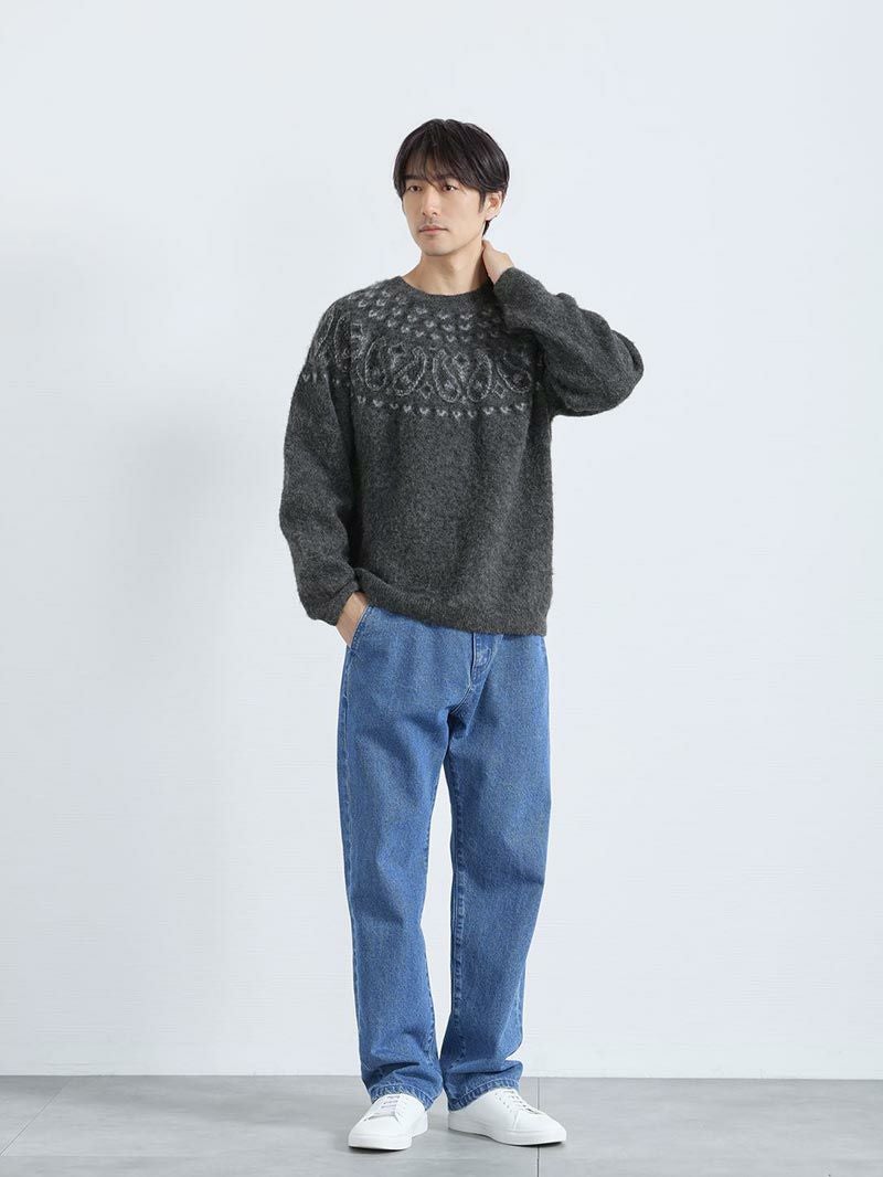 アイテム説明 静かに映える、大人の柄ニット モヘア調の起毛感と、静かに主張する求心柄。 柄物なのに主張しすぎない上品な存在感。 体型を拾わないリラックスシルエットで、休日も気取らず品よく整う。 冬らしいモヘア調の生地 起毛素材がやわらかく包み込む着心地。 ウール混でもチクチクしない上質なタッチ。 LIGHT TECHインナーとは、太陽光・室内灯の近赤外線と、身体から放射される遠赤外線を熱に変える発熱素材を使用した機能性インナーです。 着心地の良い裏起毛によって、より暖かさアップ。 また、ネックラインと袖の長さにこだわり、襟元・袖口からインナーが見えないように設計。 ニット・シャツなど、どんなトップスにも合わせることができます。 好みで選べる2タイプ首元まで暖かいクルーネックシャツと好相性のVネック LIGHT TECH クルーネックインナーTシャツ CHECK LIGHT TECH VネックインナーTシャツ CHECK サイズ・素材 身幅 裄丈 着丈 S 54 80 63 M 56 83 64 L 58 84 66 XL 60 87 68 ※表記サイズは実寸であり、個体差により誤差が生じる場合があります。 ※商品によっては洗濯タグにヌード寸法が記載されておりますが、実寸とは異なります。 伸縮性 あり ややあり なし 厚み 厚手 普通 薄手 透け感 あり ややあり なし 洗濯 洗濯OK ネット使用 手洗いのみ 表地 ポリエステル80%ナイロン14%毛5%ポリウレタン1% 裏地 なし 生産国 中国 禁止事項 乾燥機使用×漂白剤使用×日向干し× 表示を隠す サイズにお悩みですか? AIに適正サイズを聞く 返品・交換は無料で安心 ご自宅でじっくりご試着いただけます。合わなければ送料負担なく返品できます。あなたにぴったりの一着と出会えるよう、お手伝いいたします。 コーディネート Model : 179㎝ / 66㎏ / L / チャコール着用 さりげないデザインで即オシャレ 控えめな柄がほどよいポイントになり、着るだけでおしゃれに見える一枚。 きれいめなパンツとの相性もよく、仕事でも休日でも使えるスタイルです。 CODEロングスリーブTシャツ CHECK CODEテーパード ウィンター CHECK リバーシブルレザーベルト CHECK HARUSAKU 奈良産 プレーンリブソックス CHECK Model : 179㎝ / 66㎏ / L / チャコール着用 さりげないデザインで上級大人カジュアルに ふんわりとした生地にペイズリー柄をあしらったニットは、さりげない存在感が魅力。 シンプルなデニムと合わせるだけで、大人のカジュアルスタイルが完成します。 休日のショッピングやお出かけにおすすめです。 ストレートジーンズ CHECK スマートスニーカー CHECK HARUSAKU 奈良産 プレーンリブソックス CHECK リバーシブルレザーベルト CHECK Model : 179㎝ / 66㎏ / L / チャコール着用 ゆったりシルエットでつくる休日コーデ 起毛感のある生地が程よいボリュームを生み出し、体型をさりげなくカバー。 ワイドパンツを組み合わせて丸みのあるシルエットにまとめれば、穏やかな雰囲気を感じさせるリラックスムードが完成します。 ワイドチノパンツ CHECK キャンバス トートバッグ CHECK HARUSAKU 奈良産 プレーンリブソックス CHECK リバーシブルレザーベルト CHECK スタッフコーディネート もっと見る