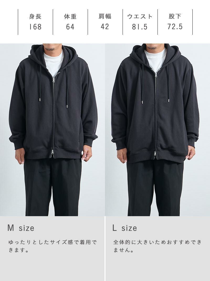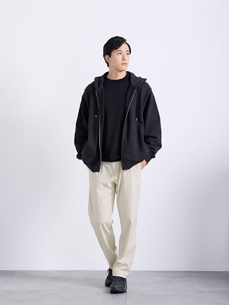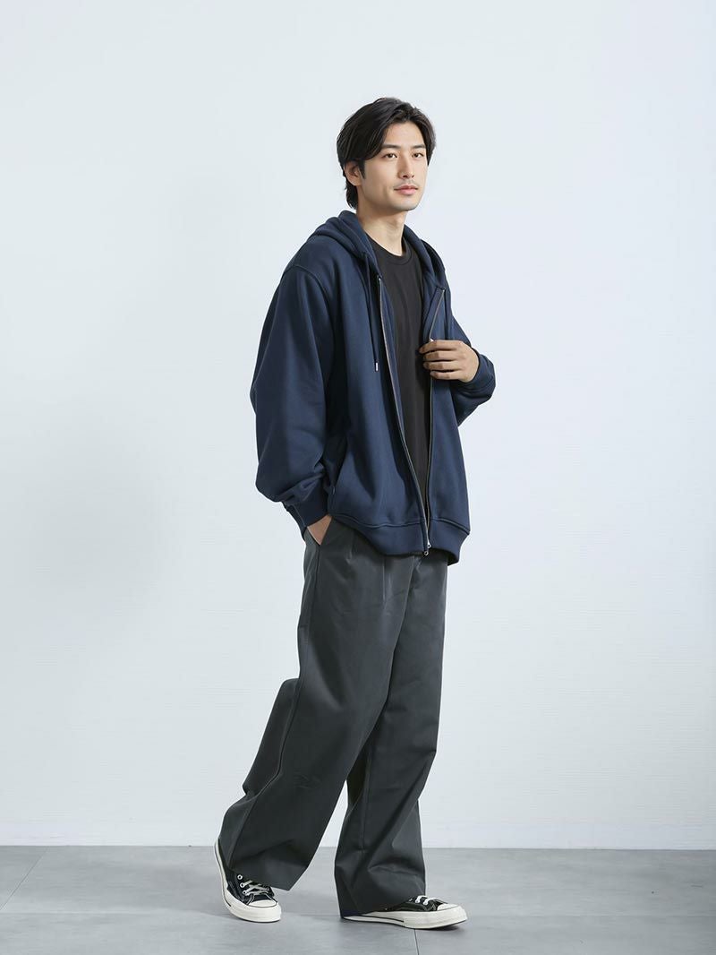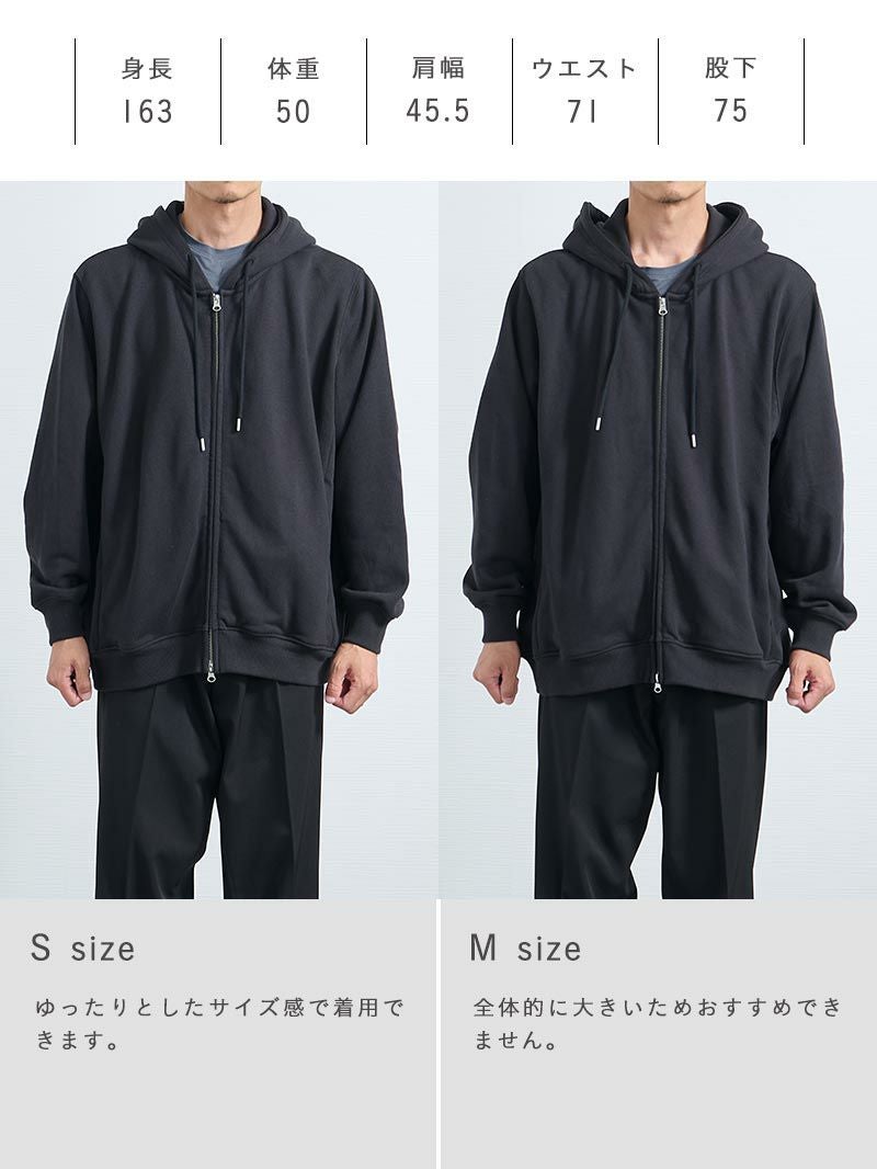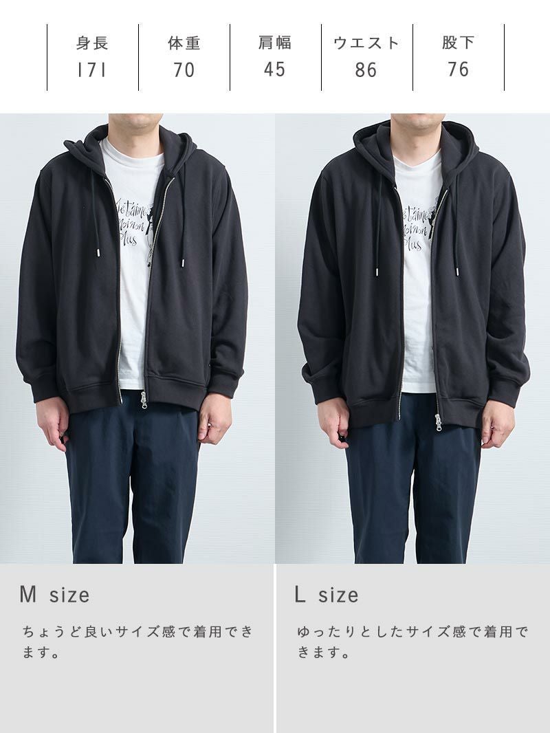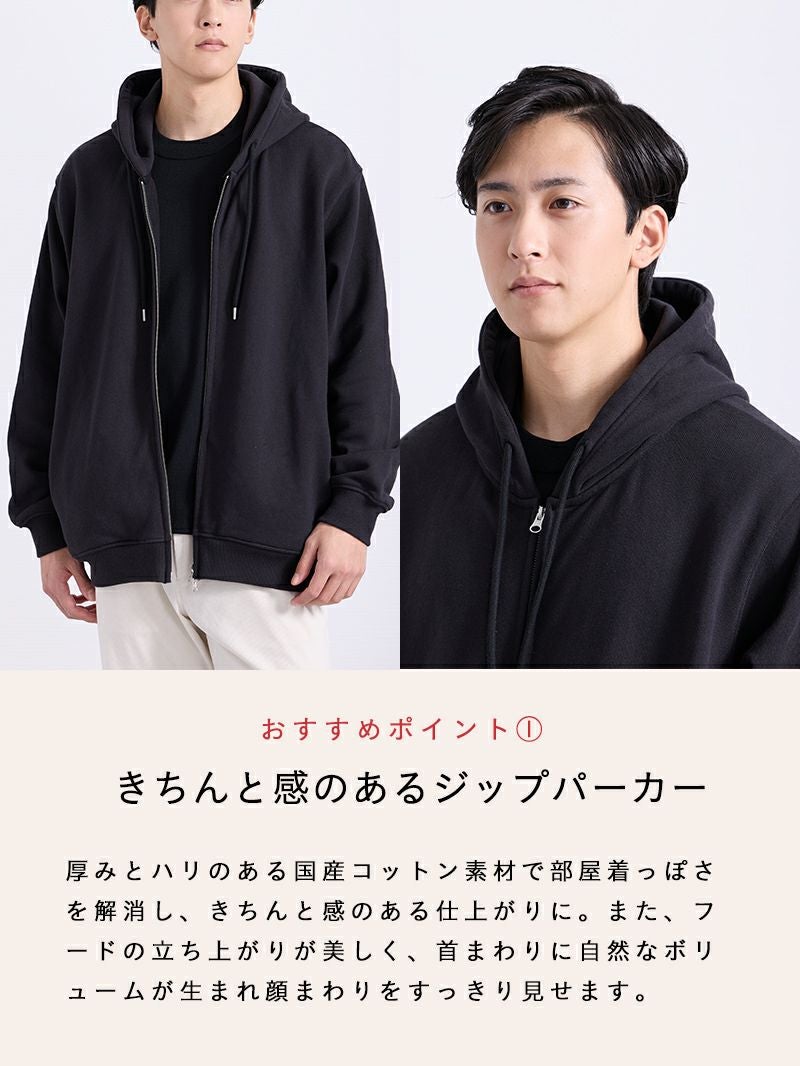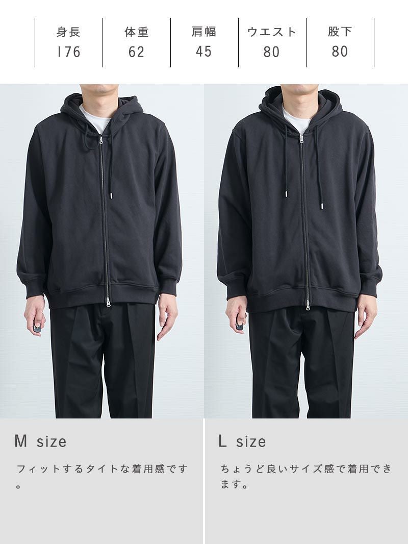 アイテム説明 いつでも気軽に羽織りたくなる見た目・着心地◎のフルジップパーカー コットンフルジップパーカーの おすすめポイント 01.部屋着感ゼロきちんと感のあるジップパーカー 厚みとハリのある国産コットン素材で部屋着っぽさを解消し、きちんと感のある仕上がりに。 また、フードの立ち上がりが美しく、首まわりに自然なボリュームが生まれ顔まわりをすっきり見せます。 02.ジップアップ仕様で着こなし自由自在 ダブルジップ仕様で気温やスタイリングに応じてシルエットを自由に調整可能。 全閉め、前開き、裾だけ開けるなど着こなしの幅が広がります。 1つのアイテムでいろいろな着こなしを楽しめるため、効率的にオシャレしたい男性にもおすすめです。 03.肌に優しい天然コットン100%だから、ずっと着ていたくなる コットン100%素材の自然でなめらかな肌触りにこだわりました。 肌への刺激が少なく、長時間着用してもストレスフリー。肌が敏感な方にもおすすめできる優しい着心地です。 04.カッコいいだけじゃない実用性もしっかりキープ 両サイドに目立ちにくいジップ付きポケットを配置。 スマホや鍵などの収納に便利で、動いても中身が落ちにくい安心設計になっています。実用性のあるスマートなデザインに。 サイズ・素材 肩幅 身幅 袖丈 着丈 S 47 66.5 59 64.5 M 48 68.5 60 66 L 50.5 70.5 61 68 XL 53 72 62 70 ※表記サイズは実寸であり、個体差により誤差が生じる場合があります。 ※商品によっては洗濯タグにヌード寸法が記載されておりますが、実寸とは異なります。 伸縮性 あり ややあり なし 厚み 厚手 普通 薄手 透け感 あり ややあり なし 洗濯 洗濯OK ネット使用 手洗いのみ 表地 本体綿100%リブ部分綿95%ポリウレタン5% 裏地 なし 生産国 中国 禁止事項 乾燥機使用×日向干し×漂白剤使用× 表示を隠す サイズにお悩みですか? AIに適正サイズを聞く 返品・交換は無料で安心 ご自宅でじっくりご試着いただけます。合わなければ送料負担なく返品できます。あなたにぴったりの一着と出会えるよう、お手伝いいたします。 コーディネート Model : 179㎝ / 66㎏ / L / ブラック着用 奥行きのある大人カジュアルに仕上げる パーカーにニットを重ねた、シンプルでも表情のあるレイヤードスタイル。 アイボリーのコーデュロイが明るさを加えて、冬の装いを軽やかに見せてくれます。 モノトーンでまとめると、全体がすっきりと整いますよ。 ハイゲージシルクニット CHECK コーデュロイ ストレートパンツ CHECK HARUSAKU 奈良産 プレーンリブソックス CHECK ナローメッシュベルト CHECK Model : 179㎝ / 66㎏ / L / ブラック着用 ジップパーカーでつくる今っぽアメカジ オーバーサイズのコットンジップパーカーを、無骨さのあるデニムパンツで合わせたアメカジコーデ。 ゆったりシルエットのラフさを活かして、デニムパンツと合わせれば今っぽさ満点の仕上がりになります。 ハイゲージ長袖カットソーWIDE CHECK ストレートジーンズ CHECK Model : 179㎝ / 66㎏ / L / ブラック着用 ワイドパンツも軽快に着こなす チェックシャツをインナーに効かせた、トラッド感のある大人カジュアル。 裾が絞られたパーカーは、ワイドパンツと合わせても野暮ったくならず、シルエットにメリハリをつけてくれます。 ワイドチノパンツ CHECK Model : 179㎝ / 66㎏ / L / ネイビー着用 引き締めで整える配色コーデに清潔感プラス ネイビーパーカーに白ニットを合わせて、クリーンな抜け感を加えました。 黒のジーンズが全体を引き締めてくれるので、コーデにまとまりが出ます。 カジュアルだけど、きちんと感も欲しい日にぴったりです。 ハイゲージシルクニット CHECK ストレートジーンズ CHECK スマートスニーカー CHECK ナローメッシュベルト CHECK Model : 179㎝ / 66㎏ / L / ネイビー着用 ゆったり着こなし休日を楽しむ 上下ゆったりのワイド×ワイドコーデは、シルエットに統一感が出て今っぽい印象に。 カジュアルになりすぎないように、落ち着いた色でまとめると、大人っぽさも演出できます。 ハイゲージ長袖カットソーWIDE CHECK ワイドチノパンツ CHECK Model : 179㎝ / 66㎏ / L / ネイビー着用 Oラインシルエットでつくるゆったりコーデ 落ち感のあるワイドパンツを合わせて、こなれた大人の着こなしに。 パーカーにボリュームがある分、パンツにも程よくゆとりを持たせると、Oラインシルエットになり、体型カバーにもおすすめです。 ハイゲージ長袖カットソーWIDE CHECK CODEワイド CHECK スタッフコーディネート もっと見る