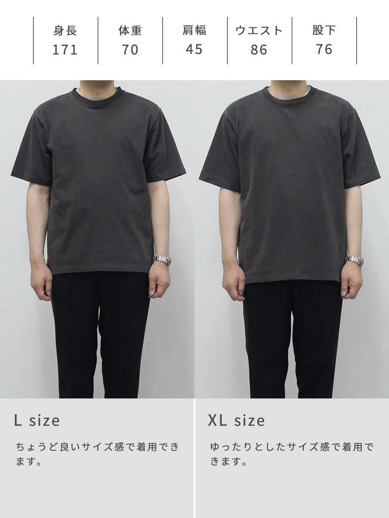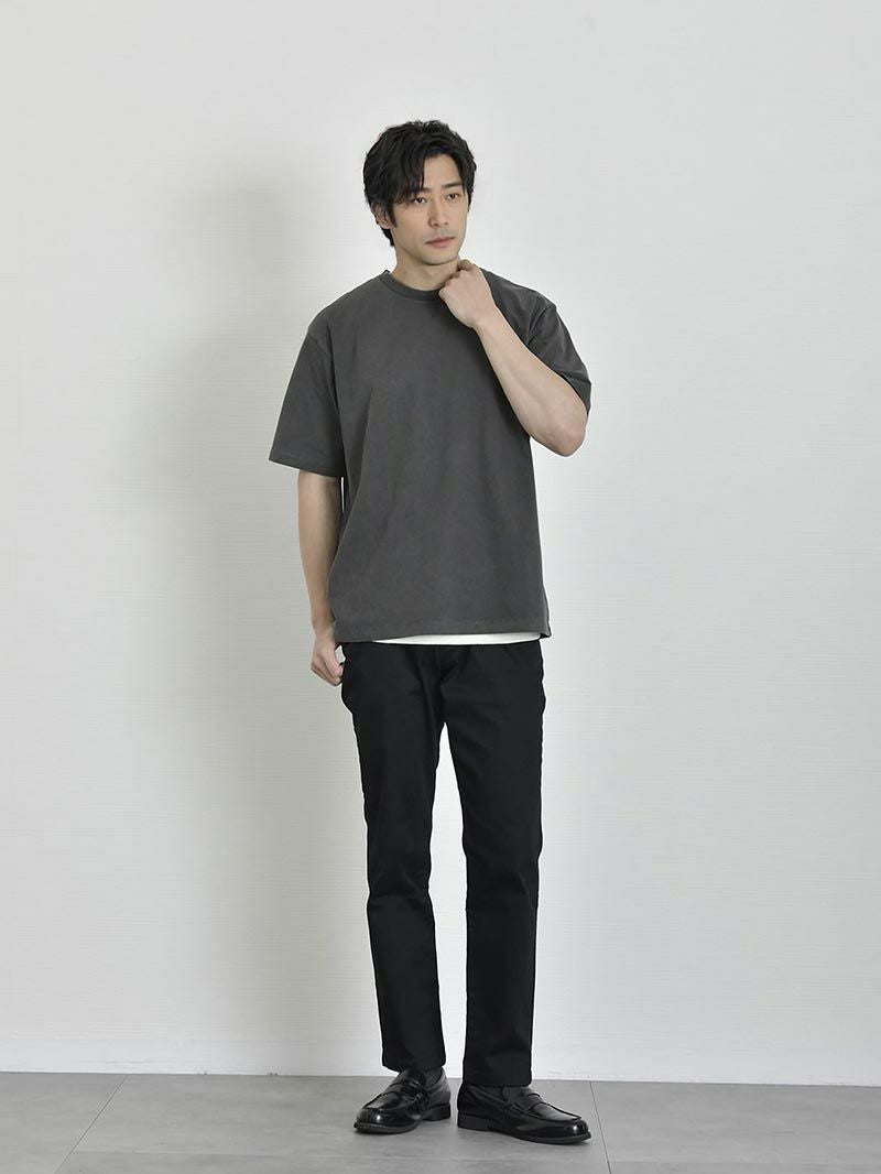 アイテム説明 100回洗ってもヘタれない。大人気商品ワイドフィットタフTシャツから限定500枚の新色登場! トレンド感を取り入れたビンテージ加工で休日のコーディネートアップグレードする至高の一枚 100回洗ってもヘタれない 上質な生地感とタフさを併せ持つプレーティング天竺を採用 もっと見る 綿80%×ポリエステル20%の混防でしっとりとした触り心地に清潔感と品性溢れる表面感を持ちながらも、100回洗濯しても全くヘタレない丈夫な生地に仕上げました。 更に、夏にうれしい機能性も充実。暑さが厳しい季節でも快適にお過ごしいただけます。 トレンドのビンテージ加工Tシャツを 大人の男性のためにブラッシュアップ 流行を取り入れ更新し続けるかっこいい大人を応援するため、今夏注目のビンテージ加工Tシャツを大人仕様にしました。 トレンドを取り入れつつも大人の品格を保つため加工感を抑えつつ色はスモーキーなチャコールを採用。 やり過ぎない見た目でキレイめなパンツでもデニムなどのカジュアルパンツでも合わせやすいアイテムに仕上げました。 左:ワイドフィットタフTシャツ/右:当製品 更にシルエットもビンテージ加工に合わせて変更。 大人の男性の品格を保つために”ワイドフィットタフTシャツ”よりも若干ワイド感を抑えています。 カジュアルな加工感とシルエットのバランスを加味してのこだわりの変更点で、ゆったり着れつつもだらしなく見えない絶妙なシルエットに仕上げています。 首元のリブ、袖、裾の幅は細いデザイン。スッキリとした見た目は大人の男性にピッタリです。 また、すべてダブルステッチ仕上げを採用。生地だけではなく縫製も強度が高いので、気を遣わずガシガシ使っていただけます。 左:レイヤード無し/右:レイヤードあり どうしても単調になってしまう夏コーデ。 簡単にレイヤードコーデが完成するタンクトップも合わせると、大人のTシャツコーデをワンランクアップすることができます。 一緒におすすめ ストレッチレイヤードタンクトップ CHECK サイズ・素材 肩幅 身幅 袖丈 着丈 S 44.5 53 23.5 65 M 46.5 56 24 67 L 49 57.5 25 69 XL 52 61 26 70 ※表記サイズは実寸であり、個体差により誤差が生じる場合があります。 ※商品によっては洗濯タグにヌード寸法が記載されておりますが、実寸とは異なります。 伸縮性 あり ややあり なし 厚み 厚手 普通 薄手 透け感 あり ややあり なし 洗濯 洗濯OK ネット使用 手洗いのみ 表地 綿70% ポリエステル30% 裏地 なし 生産国 中国 表示を隠す スタッフ試着レビュー サイズにお悩みですか? AIに適正サイズを聞く 返品・交換は無料で安心 ご自宅でじっくりご試着いただけます。合わなければ送料負担なく返品できます。あなたにぴったりの一着と出会えるよう、お手伝いいたします。 コーディネート Model : 179㎝/66㎏/ L / チャコール着用 チャコールのTシャツに黒のスリムパンツを合わせた、シンプルながらも洗練された印象のコーディネート。 インナーに白を効かせることで、控えめながら清潔感のある抜けをプラス。 足元はローファーでカジュアルすぎず、大人の休日やちょっとした外出にぴったりな都会的ミニマルスタイル。 ブラックスリムパンツ 旧型 CHECK ストレッチレイヤードタンクトップ CHECK リアルレザーベルト CHECK HARUSAKU 奈良産 プレーンリブソックス CHECK Model : 179㎝/66㎏/ L / チャコール着用 チャコールのTシャツにベージュのワイドパンツを合わせた、落ち着きと軽やかさが共存する夏のカジュアルスタイル。 シンプルながらも色合わせにセンスが光り、きれいめなシューズで全体を引き締め。ほどよいリラックス感で、休日のカフェ巡りやショッピングにもおすすめな一着。 CODEストレート サマー CHECK Uチップシューズ CHECK HARUSAKU 奈良産 バックラインソックス CHECK Model : 179㎝/66㎏/ L / チャコール着用 ストライプ調のアイボリーシャツに、チャコールのTシャツとワイドなアイボリーパンツを合わせた、軽やかで涼しげな印象のコーディネート。 編みバッグやサンダルを取り入れることで抜け感を演出し、休日の散歩やカフェ巡りにぴったりなナチュラルスタイルに仕上がっています。 シアーニット半袖シャツ CHECK タックワイドパンツ CHECK ハンドロープ サコッシュ CHECK スタッフコーディネート もっと見る