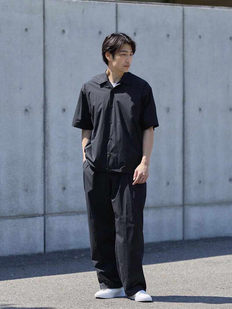 上下ブラックでも、ナイロン素材の軽やかさで、暑苦しく見えず、夏でもすっきり着られます。