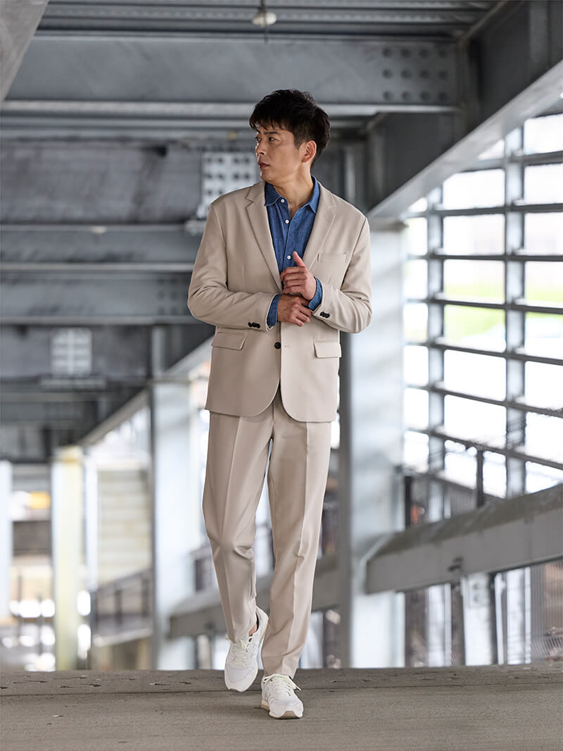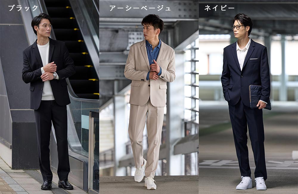 アイテム説明 セットアップで「5秒ドレスアップ」 トップスを変えるだけで、シゴトとアソビがシームレス。 エレガントな見た目だけど、自宅でケアが可能な機能性を持っています。 ※本商品は、ジャケット・パンツの2点セットです。 カットソー・シューズはコーディネート参考商品となります。 もっと見る お客様が感じるCODEシリーズの良さ ✔ オフィスでもカジュアルでも使える ✔ 楽に着られるのに、きちんと感が出る ✔ 毎日使いたくなるケアのラクさと安心感 アイテムを見る 単品でもお求めいただけます CODEジャケット CHECK CODEテーパード CHECK サイズにお悩みですか? AIに適正サイズを聞く コーディネート Model : ブラック着用 黒で魅せる上品な抜け感セットアップ 黒のセットアップにニットを合わせて、肩の力を少し抜いた雰囲気に。 同じ色でも素材が違うだけで、光の当たり方や立体感まで変わって見えます。夜の食事にもおすすめです。 ハイゲージシルクニット CHECK Salvatole Marra シンプル腕時計 CHECK Model : アーシーベージュ着用 ベージュ×ブルーで楽しむ都会的カジュアル ベージュのセットアップにデニムシャツで程よくカジュアルダウン。 インナーのブルーが差し色となり、全体を軽快に見せます。休日の街歩きにもぴったり。 ルーズシルエットデニムシャツ CHECK Model : ネイビー着用 ネイビーで作る軽やかオフィススタイル 足元に白を差すだけで、ネイビーのセットアップがぐっと軽く見えるスタイル。 仕事帰り、そのまま友人と食事へ…そんな流れが似合うスタイルです。 レギュラーカラーシャツ CHECK 注意事項 ■購入時の注意事項 お届けするアイテムのサイズ・カラーは固定となっており、各アイテムごとにお選びいただくことはできません。【返品交換について】をご確認の上、お手続きをお願いいたします。 ■返品時の注意事項 【セット商品全て】のみお受けいたします。(一部返品はお受けできません) ■交換時の注意事項 ※通常商品の交換対応とはお手続きが異なりますのでご注意ください。 ・サイズ交換は一部の商品についてもお受けいたします。 ・交換をお受けできるのはサイズのみとなっており、カラーは固定となっております。 ・交換在庫の有無を事前に確認いたしますので、下記の専用フォームよりお問い合わせください。 ・お問い合わせ後に在庫の有無とお手続きに関するメールをお送りいたしますので、しばらくお待ちください。 お問い合わせはこちらから ※交換在庫がなくご希望に添えない場合がございます。ご了承ください。 ※セット商品は予告なく販売終了する場合がございます。