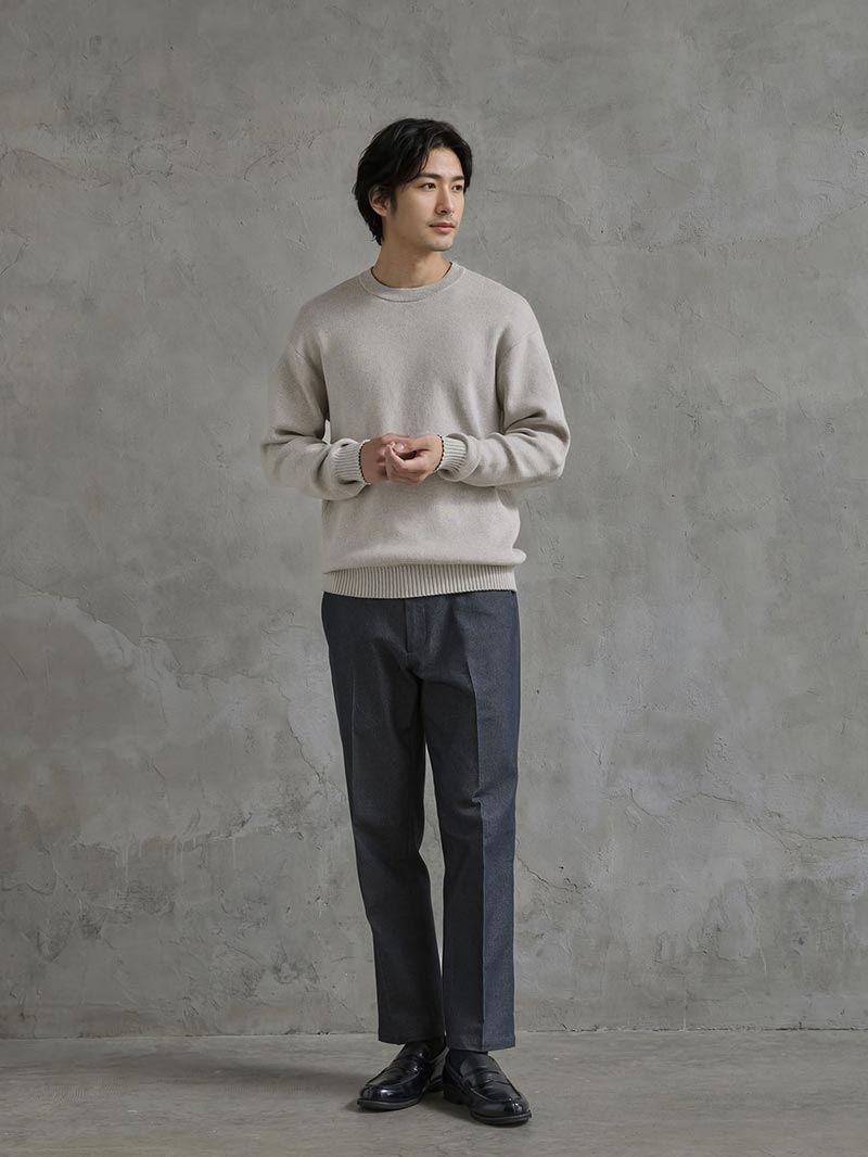 滑らかな表面感のニットを合わせて柔らかさをプラスすることで、かっちりとしすぎず好印象になります。