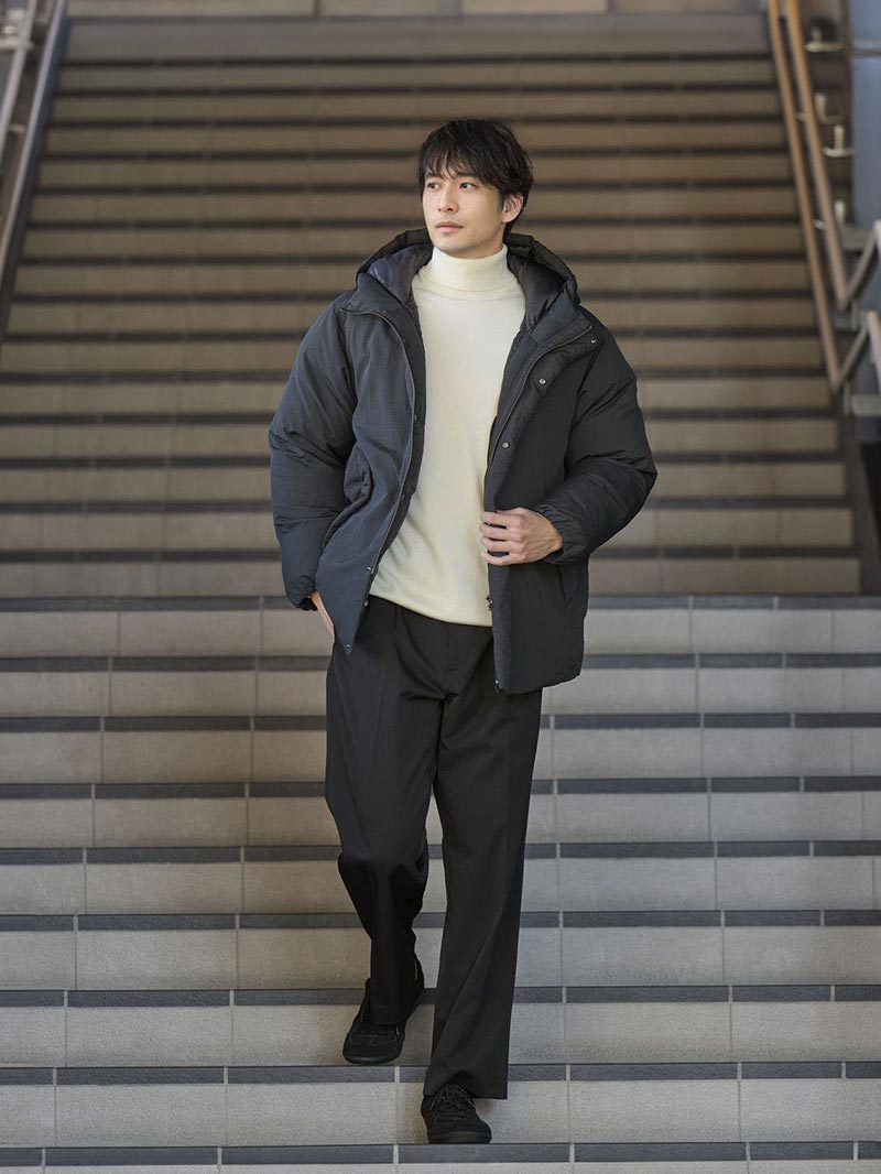 ボリュームのあるアウターで季節感を出すのもポイント。
