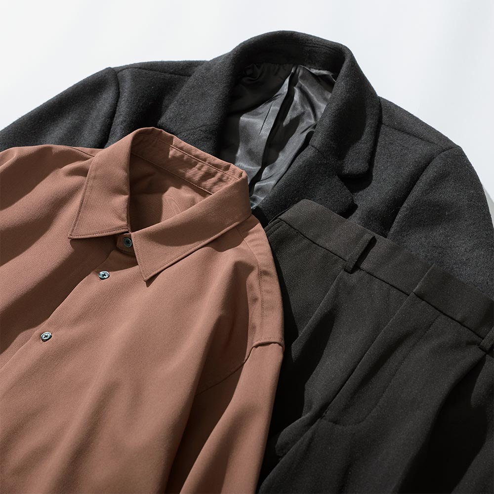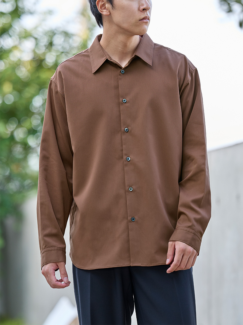 ブラウンシャツの温かみと、ストレートパンツのきちんと感が調和し、カジュアルすぎない絶妙なバランスに仕上がります。