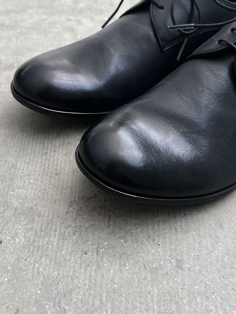 牛革の銀面を甘擦りし、丁寧にクリームを馴染ませたしなやかなアッパー。定番のラウンドトゥを少し内側に振った木型が印象的。パンツのシルエットも選ばずシンプルなデザインだからこそ素材やシルエットの良さが際立つ1足です。様々なカジュアルスタイルからお仕事用のアイテムとしてもおすすめです。