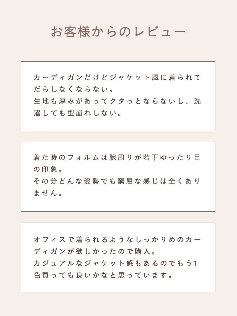 アイテム説明 ジャケット見えする”きちんと感”でオンオフ使いやすいカーディガン ワッフルショールカーディガンの おすすめポイント 01. オンオフで着られるスマートさ カジュアルなジャケット感覚で着られる”きちんと感”が魅力。 窮屈感なくスマートに着こなせて、トップスにさっと羽織るだけでオフィススタイルが完成。 もちろん休日にも活躍する使いやすさです。 02. ロングシーズン快適な着心地 ニットならではの伸縮性と、通気性に優れたワッフル編みで快適な着心地を実現。 程よい温度調節ができるため、春のはじまりから晩秋まで長いシーズン活躍する、季節の変わり目に頼れる一枚です。 ※ブランド名変更のため、一部商品タグには旧ブランド名が記載されております。品質やデザインに変更はございませんので、ご安心ください。 03. シワになりにくい柔らか素材 柔らかな生地はシワになりにくく、手に持ったりリュックに入れても型崩れの心配なし。 急な温度調整が必要な場面にも重宝します。 04. 便利なポケット付きでちょっとした外出に使いやすい お客様の声にお応えして、ポケット付きデザインにリニューアル。 アウターとしての機能性がさらにアップし、ちょっとしたお出かけやオフィスでより活躍します。 よりカジュアルに使うなら同素材のこちらがおすすめ 休日スタイルやリラックスシーンには、同じワッフル素材のこちらが最適。オフィス用のショールカラーと使い分ければ、シーンに合わせた着こなしが楽しめます。 ワッフルカーディガン CHECK サイズ・素材 肩幅 身幅 袖丈 着丈 S 45 52 54.5 69 M 47 53.5 55.5 71 L 48 55.5 56.5 73 XL 52 58 58 75.5 ※表記サイズは実寸であり、個体差により誤差が生じる場合があります。 ※商品によっては洗濯タグにヌード寸法が記載されておりますが、実寸とは異なります。 伸縮性 あり ややあり なし 厚み 厚手 普通 薄手 透け感 あり ややあり なし 洗濯 洗濯OK ネット使用 手洗いのみ 表地 ポリエステル59%綿41% 裏地 なし 生産国 中国 禁止事項 乾燥機使用×漂白剤使用× 表示を隠す サイズにお悩みですか? AIに適正サイズを聞く 返品・交換は無料で安心 ご自宅でじっくりご試着いただけます。合わなければ送料負担なく返品できます。あなたにぴったりの一着と出会えるよう、お手伝いいたします。 コーディネート Model : 183㎝ / 64㎏ / XL / Dネイビー着用 大人の日常にちょうどいい、好印象コーデ ショールカラーは、大人だけが似合う上品アイテム。 バンドカラーのシャツと合わせれば、落ち着きのあるコーデが完成します。 インナーをTシャツにすればスポーティにイメージチェンジも簡単にできますよ。 バンドカラーシャツ CHECK CODEイージーパンツ CHECK Healthknit 3足セット CHECK スマートスニーカー CHECK Model : 183㎝ / 64㎏ / XL / Dネイビー着用 きちんと感と抜けを意識した大人コーデ 存在感のあるショールカラーに合わせたいのが、バンドカラーシャツ。 襟元に装飾がない分、重ねたときも首元がすっきりとおさまります。 きちんと感のあるパンツとも好相性で、程よく力の抜けたスタイルが完成します。 バンドカラーシャツ CHECK CODEイージーパンツ CHECK Healthknit 3足セット CHECK スマートスニーカー CHECK Model : 183㎝ / 64㎏ / XL / 杢グレー着用 肩の力を抜く、こなれた大人コーデの最適解 インナーにカットソーを選べば、脱力感のある程よくカジュアルな着こなしが簡単に完成します。 ニットの持つ優しげな印象を活かした、好印象度高めな着こなしには、白の分量を多めにすることも効果絶大です。 CODEロングスリーブTシャツ CHECK CODEイージーパンツ CHECK Healthknit 3足セット CHECK スマートスニーカー CHECK Model : 183㎝ / 64㎏ / XL / 杢グレー着用 優しげな印象はグレーグラデで演出 グレーでまとめたコーデは、ソフトな印象を演出するのに最適な着こなし。 カーディガンなら、より優しいイメージで着こなすのに最適です。 あえて足元をホワイトにすれば若々しさもプラスできます。 リラクシーデニムシャツ CHECK CODEイージーパンツ CHECK ナローリアルレザーベルト CHECK スマートスニーカー CHECK スタッフコーディネート もっと見る