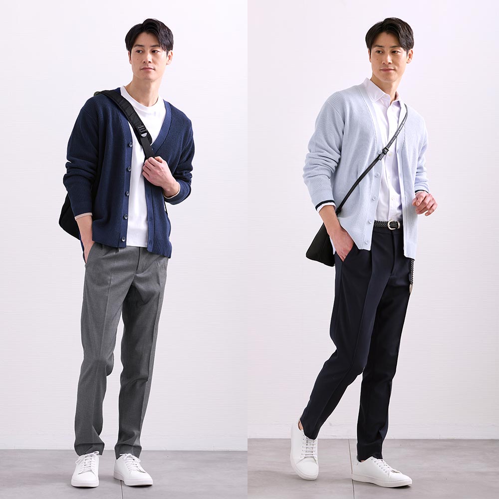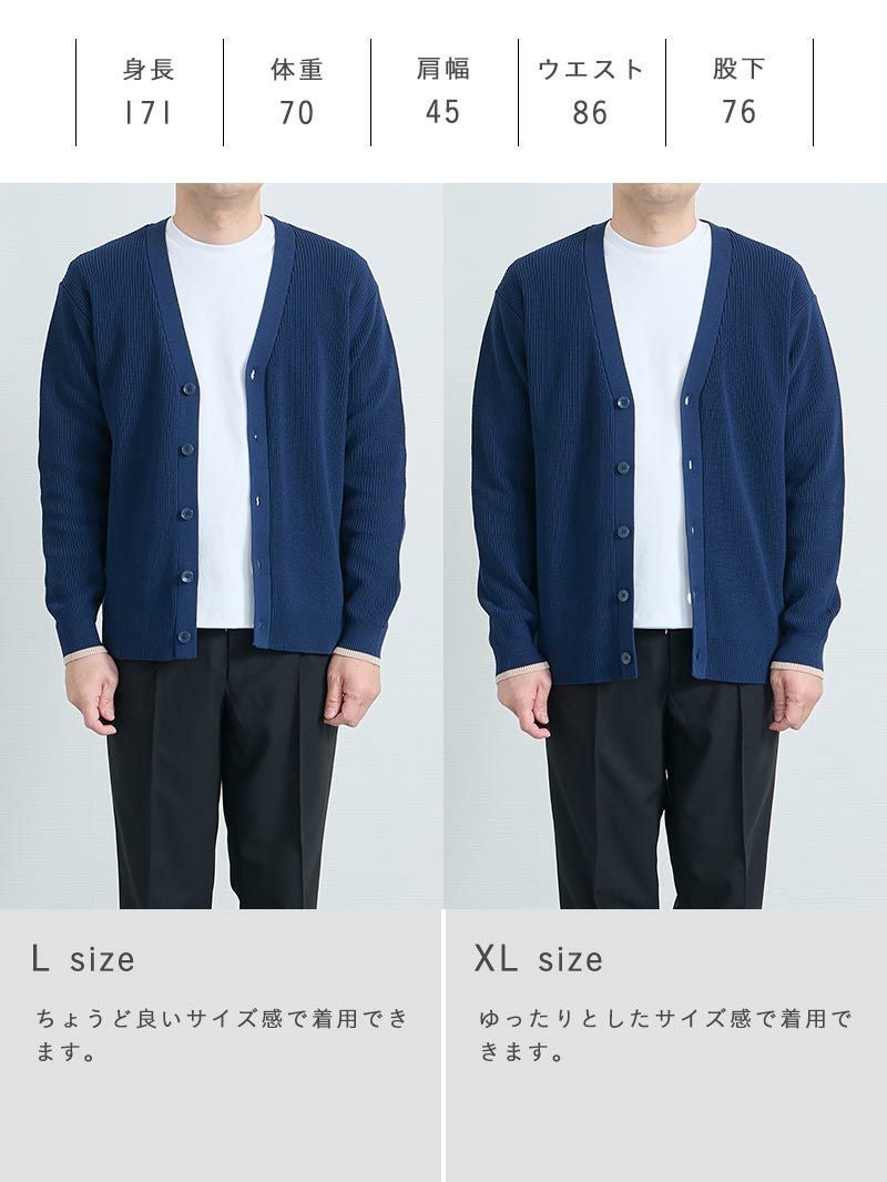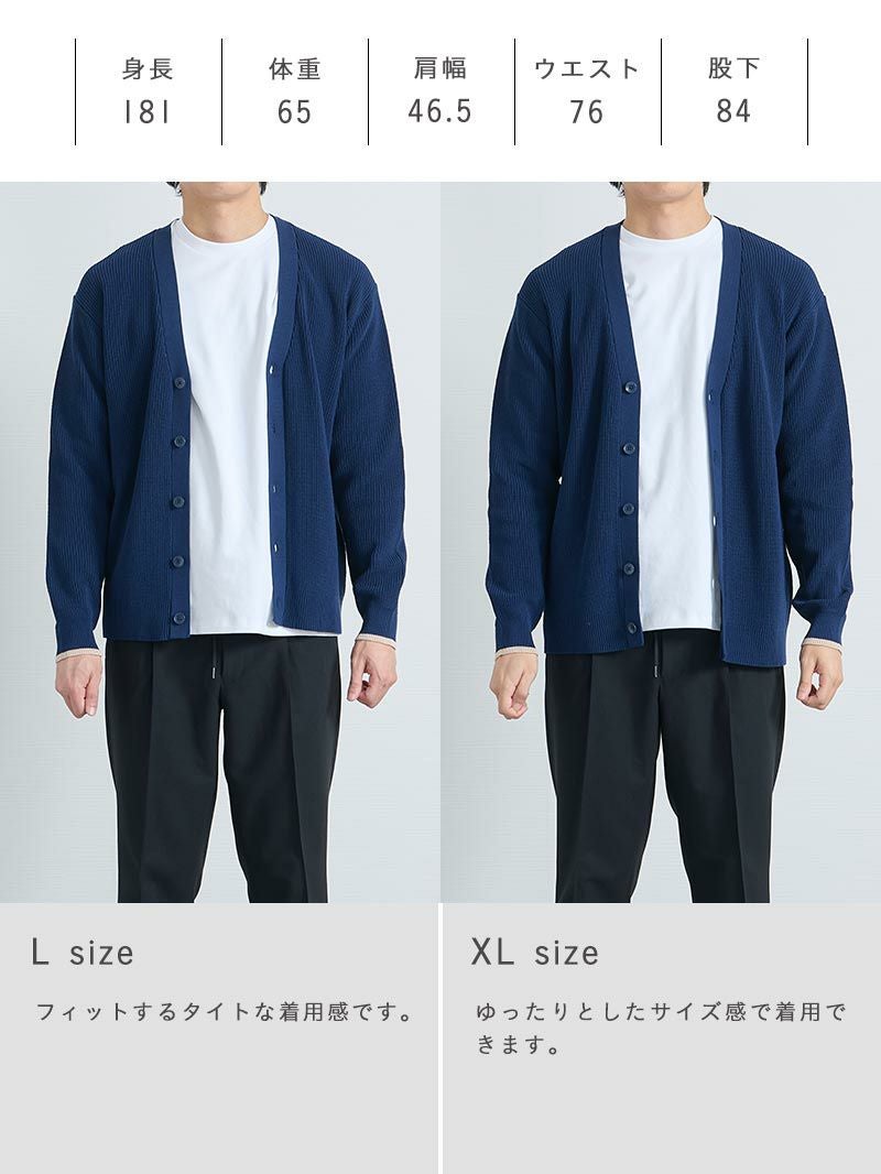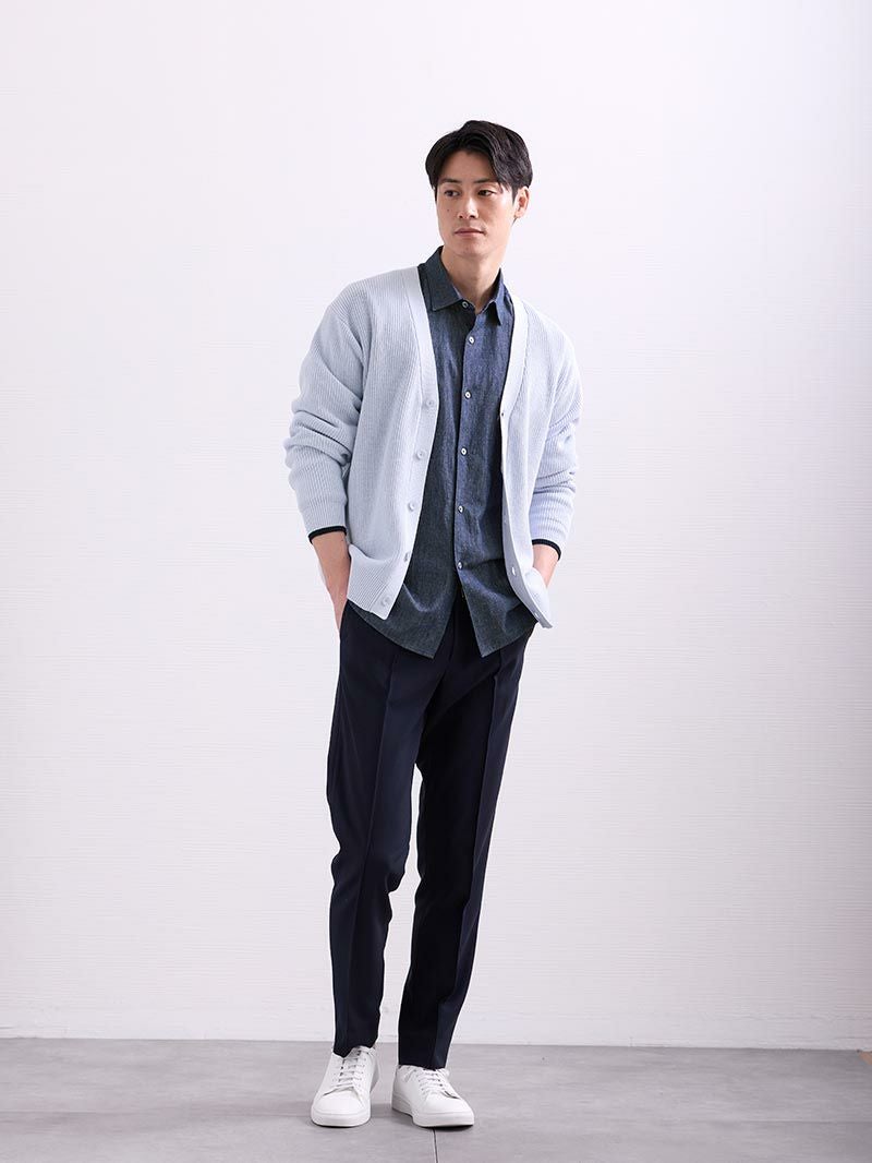 アイテム説明 重くなりすぎず暖かい脱ベーシックな差別化カーディガン 畔編みニットカーディガンの おすすめポイント 01. 季節の変わり目に使いやすい一枚 凹凸感のある畔編みで通気性を確保し、軽やかな印象に。 立体的な編み目が空気を含むことで程よい保温性も実現。 重くなりすぎず暖かい、快適な着心地で季節の変わり目に活躍する一枚です。 畔編み(あぜあみ)とは 表目と裏目を交互に編むことで縦に畝(うね)のような凹凸を作り出すニットの編み方。 高い伸縮性と厚み、保温性、型崩れしにくい丈夫さが特徴です。 02. 爽やかカラーと印象的なリブデザイン 清潔感のあるネイビーと春らしいライトブルーの2色展開。 袖に入ったバイカラーのリブデザインが派手過ぎず、さりげないオシャレを演出。 大人の洗練されたスタイルを叶えます。 03. 自宅で洗えるから毎日着たくなる 自宅で気軽に洗濯できるイージーケア仕様。 ドライタッチ素材で、洗濯後もサラリとした肌触りが続きます。 お手入れ簡単で朝のコーデに迷ったとき、つい手を伸ばしたくなる一枚です。 おすすめの着こなしテクニック 中に合わせるアイテムはシンプルに インナーはシンプルなアイテムを選ぶのがおすすめ。 袖元のデザインがさりげないアクセントになり、主張しすぎず着こなしを格上げします。 きれいめからカジュアルまで幅広く対応する一枚です。 おすすめの無地インナーはこちら CODEジャージーシャツ CHECK CODEオックスシャツ CHECK ハイゲージ長袖カットソー CHECK サイズ・素材 肩幅 身幅 袖丈 着丈 S 45 52 58 62.5 M 46 53 59 63 L 47 55.5 60 65 XL 48 57.5 60.5 67 ※表記サイズは実寸であり、個体差により誤差が生じる場合があります。 ※商品によっては洗濯タグにヌード寸法が記載されておりますが、実寸とは異なります。 伸縮性 あり ややあり なし 厚み 厚手 普通 薄手 透け感 あり ややあり なし 洗濯 洗濯OK ネット使用 手洗いのみ 表地 綿53%アクリル47% 裏地 なし 生産国 中国 禁止事項 漂白剤使用×乾燥機使用× 表示を隠す サイズにお悩みですか? AIに適正サイズを聞く 返品・交換は無料で安心 ご自宅でじっくりご試着いただけます。合わなければ送料負担なく返品できます。あなたにぴったりの一着と出会えるよう、お手伝いいたします。 コーディネート Model : 183㎝ / 64㎏ / L / ネイビー着用 お馴染み色でカジュアルコーデがより身近に 休日コーデにお悩みの方へおすすめしたいのが、オフィス服でも親近感のある色のアイテムを使った着こなしです。 インナーに白のカットソーを選んで、清潔感をプラスしましょう。 白のシャツなども好相性です。 ハイゲージ長袖カットソー CHECK CODEテーパード ウールブレンド 通年用 CHECK スマートスニーカー CHECK Model : 182㎝ / 70㎏ / L / ネイビー着用 清潔感と着心地の絶妙バランス オフィカジ成功のために意識したいのは、コーディネートに使う色数です。 こんな風に3色以内にまとめれば、品よく着こなすことが可能です。すっきりとした縦長なラインを意識してスタイルアップも目指しましょう。 ハイゲージ長袖カットソー CHECK CODEイージーパンツ CHECK リバーシブルレザーベルト CHECK スマートスニーカー CHECK Model : 183㎝ / 64㎏ / L / ライトブルー着用 春色を主役にいつものコーデを新鮮に見せる まだまだ少し肌寒さのある春先、でも誰よりも早く春は先取りしたい、そんな方におすすめなのが明るい春色をアクセントにしたコーデです。 甘くならない寒色系の春色は、ネイビー系コーデとも相性抜群です。 リラクシーデニムシャツ CHECK CODEイージーパンツ CHECK リバーシブルレザーベルト CHECK スマートスニーカー CHECK Model : 183㎝ / 64㎏ / L / ライトブルー着用 休日の街に映える春色の着こなし 重いアウターを脱ぐ季節、いつもと違う、軽やかな色を効かせたコーディネートで、新鮮な印象に仕上げるのもおすすめです。 顔周りも明るく、休日のデートスタイルでも、春らしさを味方につけましょう。 CODEオックスシャツ CHECK CODEイージーパンツ CHECK ナローメッシュベルト CHECK オールブラックキャンバスミニバック CHECK スタッフコーディネート もっと見る