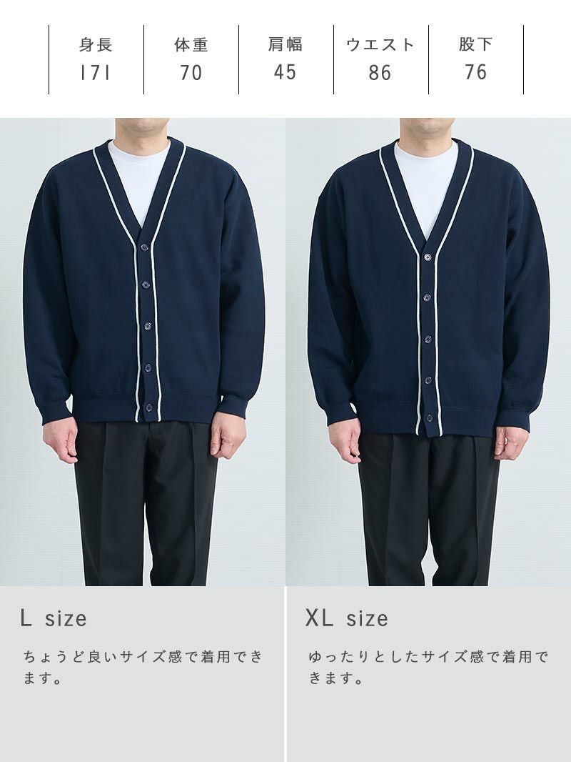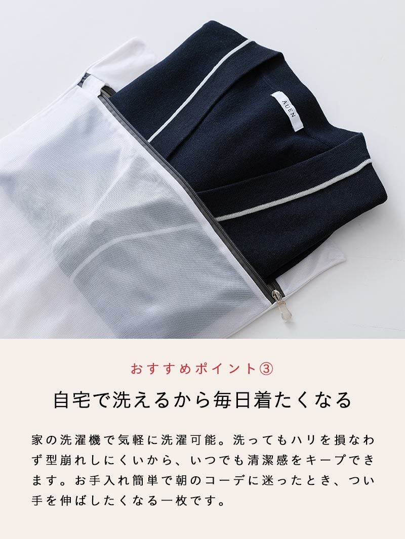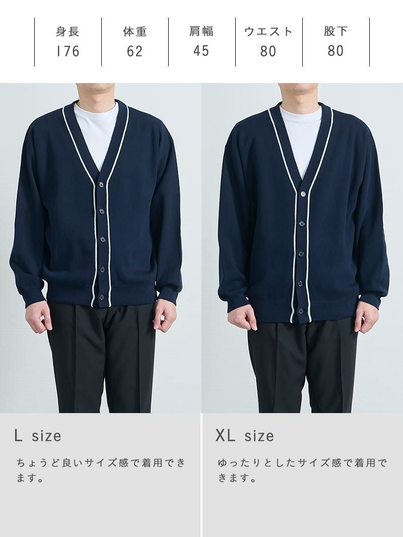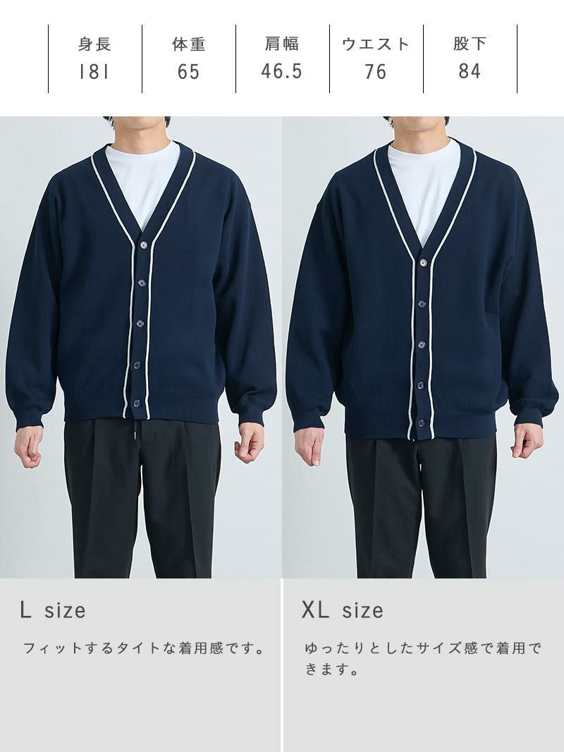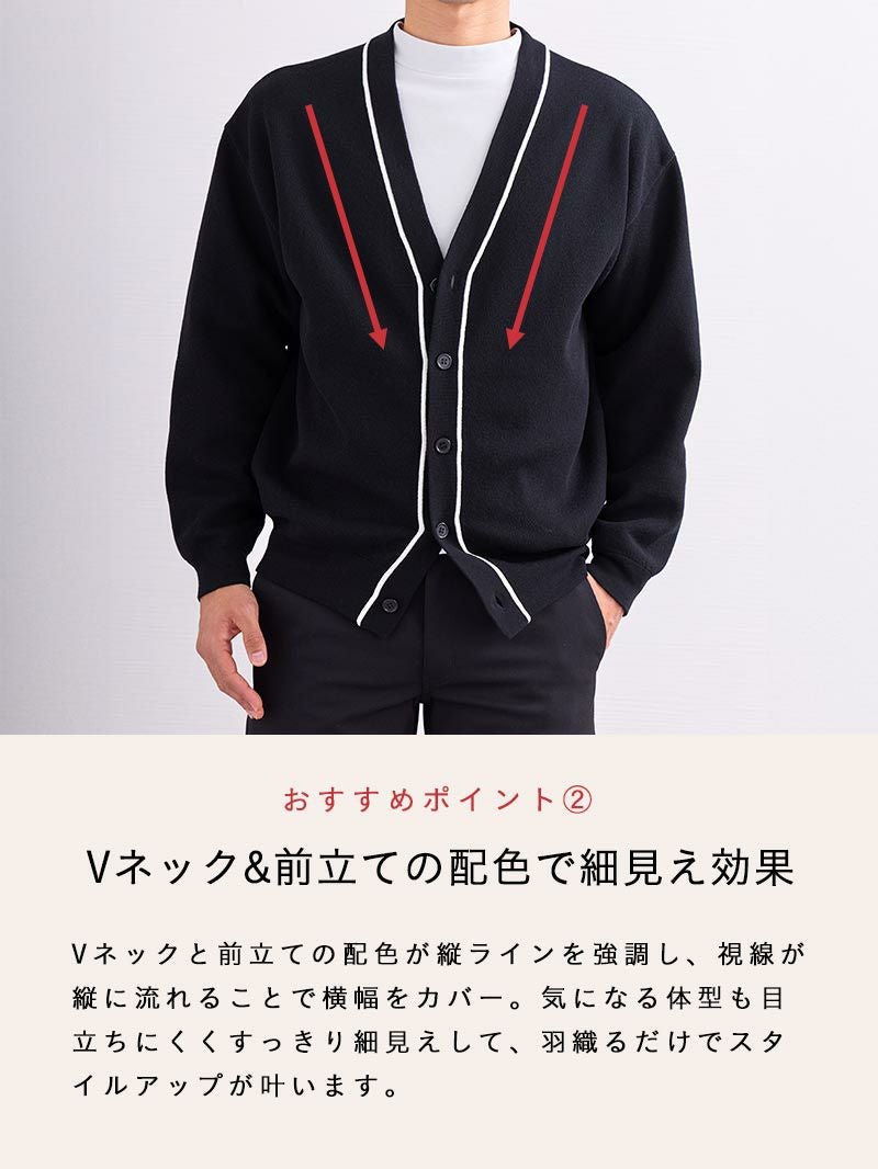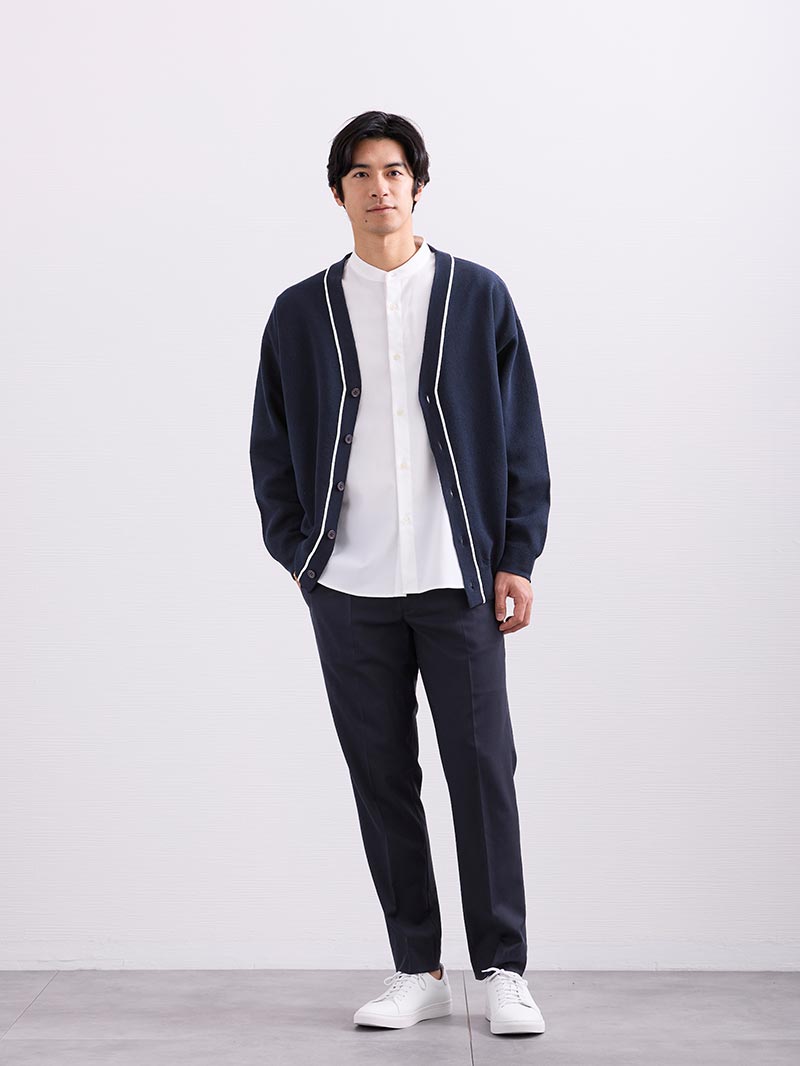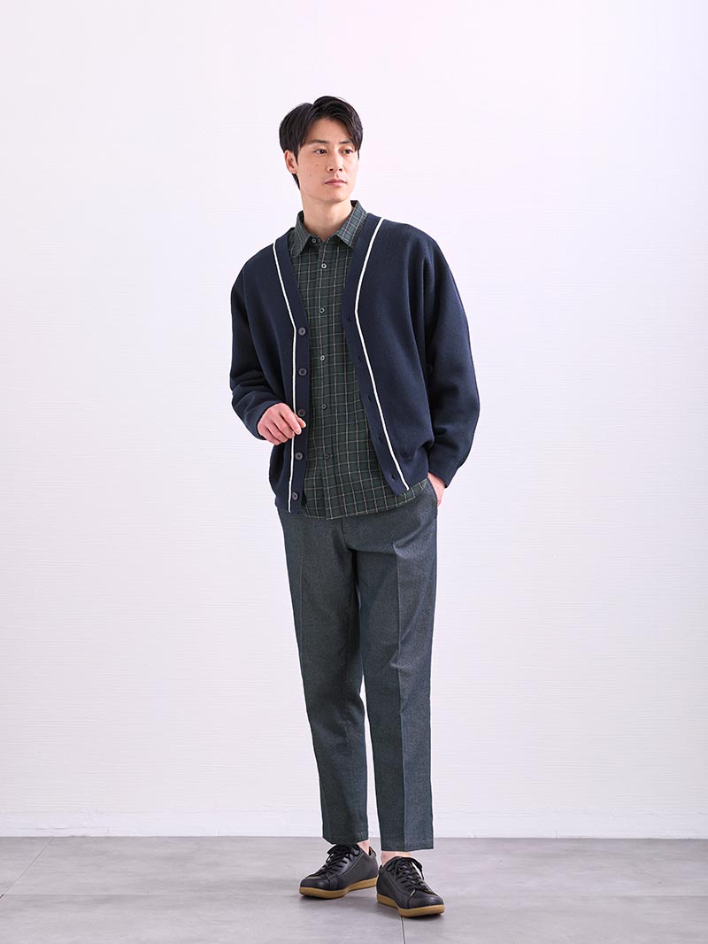 アイテム説明 着こなしのアクセントにぴったりスタイルアップも叶うカーディガン ダブルジャガードハイゲージカーディガンの おすすめポイント 01. 季節の変わり目に最適な一枚 ドライタッチ仕様で熱や湿気がこもりにくくベタつきを抑え、さらにダブルジャガード編みの程よい厚みが冷えも和らげます。 暖かい日も肌寒い日も快適な、季節の変わり目の頼れる一枚です。 ダブルジャガード編みとは 裏側に糸を渡さずに柄を編み込むことで、しっかりとした厚みとハリ、優れた保温性を持つのが特徴です。 02. Vネック&前立ての配色で細見え効果 Vネックと前立ての配色が縦ラインを強調し、視線が縦に流れることで横幅をカバー。 気になる体型も目立ちにくくすっきり細見えして、羽織るだけでスタイルアップが叶います。 03. 自宅で洗えるから毎日着たくなる 家の洗濯機で気軽に洗濯可能。 洗ってもハリを損なわず型崩れしにくいから、いつでも清潔感をキープできます。 お手入れ簡単で朝のコーデに迷ったとき、つい手を伸ばしたくなる一枚です。 おすすめの着こなしテクニック 中に合わせるアイテムはシンプルに 前立てのラインがさりげないアクセントになるから、シンプルなシャツやカットソーと合わせるだけでサマになります。 いつものコーデが一気に垢抜ける、脱マンネリな着こなしに。 おすすめの無地インナーはこちら CODEジャージーシャツ CHECK CODEオックスシャツ CHECK CODEロングスリーブTシャツ CHECK サイズ・素材 肩幅 身幅 袖丈 着丈 S 54 59 54 61.5 M 56 61 54.5 64 L 58 63 55.5 66 XL 60 65 56 68 ※表記サイズは実寸であり、個体差により誤差が生じる場合があります。 ※商品によっては洗濯タグにヌード寸法が記載されておりますが、実寸とは異なります。 伸縮性 あり ややあり なし 厚み 厚手 普通 薄手 透け感 あり ややあり なし 洗濯 洗濯OK ネット使用 手洗いのみ 表地 ポリエステル70%再生繊維(セルロース)30% 裏地 なし 生産国 中国 禁止事項 乾燥機使用×日向干し×漂白剤使用× 表示を隠す サイズにお悩みですか? AIに適正サイズを聞く 返品・交換は無料で安心 ご自宅でじっくりご試着いただけます。合わなければ送料負担なく返品できます。あなたにぴったりの一着と出会えるよう、お手伝いいたします。 コーディネート Model : 182㎝ / 70㎏ / L / ネイビー着用 雰囲気のある上級者の休日に バンドカラーのホワイトを多く見せた、抜け感のある休日の着こなしは、デートでも大人っぽさを演出でき、おすすめです。 カーディガンの持つソフトな印象と流れるような素材感のバンドシャツが好相性です。 バンドカラーシャツ CHECK CODEテーパード ウールブレンド 通年用 CHECK ナローメッシュベルト CHECK スマートスニーカー CHECK Model : 183㎝ / 64㎏ / L / ネイビー着用 ちょうどいいコンサバ感で休日を格上げ トラッドな雰囲気のチェックシャツを効かせて、休日スタイルに上品さをプラスした着こなし。 カーディガンのラインが縦を強調し、全体をスマートに見せてくれます。 落ち着いた雰囲気でまとめたい方にもおすすめです。 ビエラ起毛チェックネルシャツ CHECK CODEテーパード デニム CHECK リバーシブルレザーベルト CHECK Model : 182㎝ / 70㎏ / L / ブラック着用 すっきりカジュアルはIラインを意識したい なんとなくモノトーンを選ぶのではなく、重たくならない黒の着こなしを意識して選んで休日服をアカ抜けて見せましょう。 胸元と足元に白を効かせることで、引き締めとともに黒をより軽快に仕上げることができます。 CODEロングスリーブTシャツ CHECK ブラックスリムパンツ CHECK ナローメッシュベルト CHECK スマートスニーカー CHECK Model : 183㎝ / 64㎏ / L / ブラック着用 安心感も高い!オフィカジに最適な着こなし モノトーンの着こなしは、ジャケットを着ないオフィカジの日にも安心のスタイル。 カーディガンに施されたホワイトのラインが、シンプルながらオシャレ感を高め、感度の高さを演出するのに最適です。 CODEオックスシャツ CHECK CODEテーパード ウールブレンド 通年用 CHECK ナローメッシュベルト CHECK 日本製 コンチョ付きブレスレット CHECK Model : 182㎝ / 70㎏ / L / モカ着用 好印象のまろやか茶系でビジカジを春らしく ジャケットを必要としないオフィスで1日過ごす日には、カーディガン&CODEイージーパンツの知的なビジカジがおすすめです。 ベージュ〜明るいブラウンは、オフィスに欠かせない大人の品格を感じさせてくれます。 CODEオックスシャツ CHECK CODEイージーパンツ CHECK リバーシブルレザーベルト CHECK スマートスニーカー CHECK Model : 183㎝ / 64㎏ / L / モカ着用 ラフすぎない脱力感で洗練されたオフ服に デニムにカットソーというカジュアルの永遠コーデに、上品な色合いのカーディガンをプラスすることで大人っぽさとさりげない余裕を演出することができます。 腕元を少し捲ると、男らしさがプラスされますよ。 CODEロングスリーブTシャツ CHECK ストレートジーンズ CHECK ナローメッシュベルト CHECK スマート