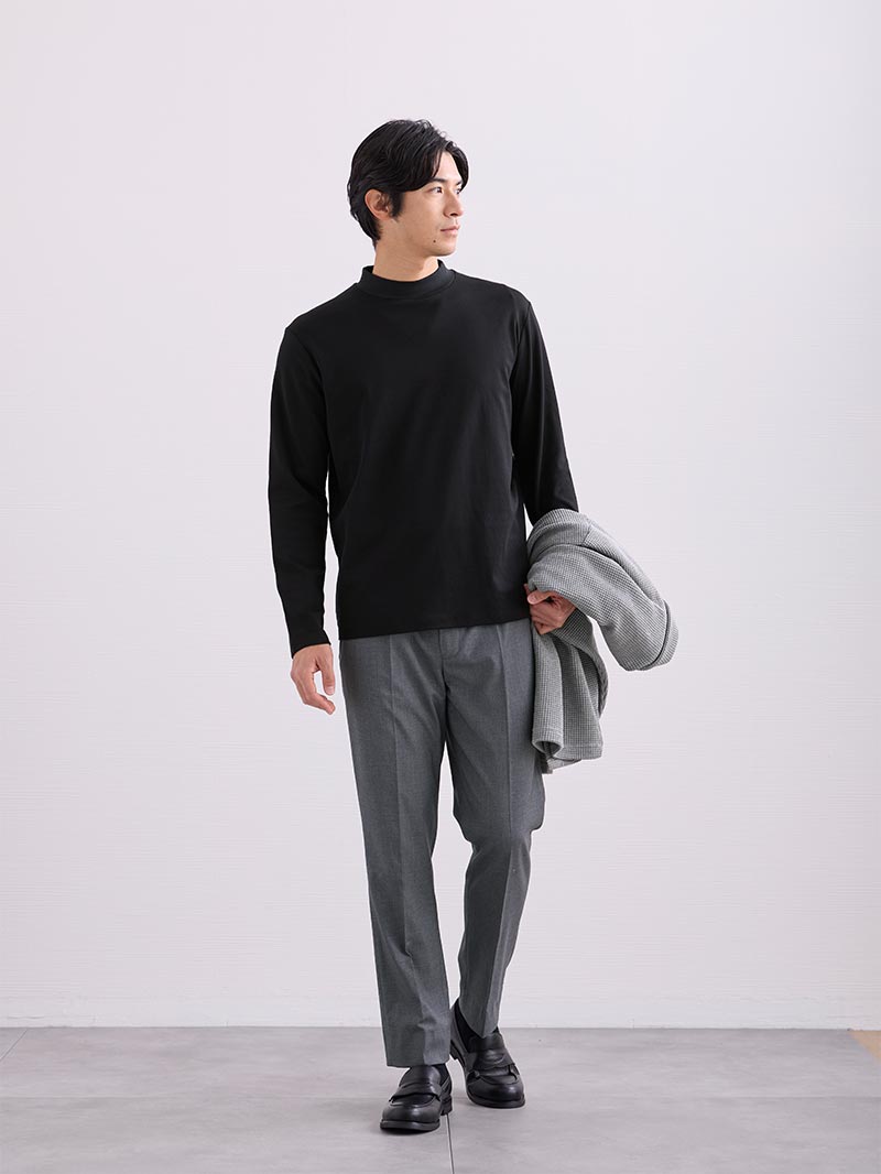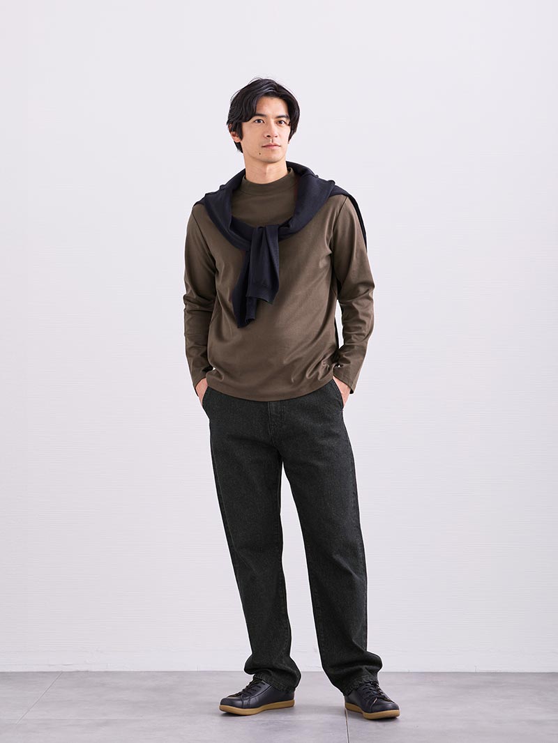 アイテム説明 長く着られる、大人のための上質Tシャツ 快適性・機能性・品格を一度に叶える大人のTシャツです。 ジャケットのインナーから休日カジュアルまで、シーンレスに活躍します。 【新色】これからの季節に活躍爽やかなネイビーカラーが登場 定番として支持の高いネイビーが新色として登場。 落ち着きと清潔感を備え、爽やかな印象を与えたい人におすすめです。 これからの汗ばむ季節も、汗ジミが目立ちにくいのも嬉しいポイント。 CODEロングスリーブTシャツの おすすめポイント 01. 素材へのこだわり コットン100%使用、通気・吸湿性に優れ、汗ムレを軽減でき、快適な着心地に。 シルケット加工により、綿糸の表面をなめらかに整え、まるでシルクのような上品な光沢を実現しました。 シルケット加工とは… 綿糸を特殊液に浸し表面を整えることで、光沢感が加わります。 また、毛羽立ちや色褪せの抑制、型崩れしにくい耐久性向上などメリットがあります。 02. 体型に響かないゆとりのある絶妙シルエット 体のラインを拾いすぎず、適度なゆとりでリラックス感を演出。 だらしなく見せず、都会的な抜け感と清潔感を両立します。 毎年の流行に左右されないシンプルな形で、長く愛用いただけます。 03. ネックデザインでコーデの印象に変化を 着こなしやシーンに合わせて選べるよう、首元の印象が異なる2型を用意。 クルーネックは汎用性が高く、モックネックは程よいきちんと感を演出するときなど使い分けることが可能です。 同素材のワイドシルエットタイプ ハイゲージ長袖カットソーWIDE CHECK サイズ・素材 肩幅 身幅 袖丈 着丈 S 42.5 51 59.5 62.5 M 44 53 61 63.5 L 47 55 61.5 65.5 XL 48 56.5 63.5 68 ※表記サイズは実寸であり、個体差により誤差が生じる場合があります。 ※商品によっては洗濯タグにヌード寸法が記載されておりますが、実寸とは異なります。 伸縮性 あり ややあり なし 厚み 厚手 普通 薄手 透け感 あり ややあり なし 洗濯 洗濯OK ネット使用 手洗いのみ 表地 【本体】 綿100%【リブ部分】 綿78% / ポリエステル22% 裏地 なし 生産国 中国 禁止事項 乾燥機使用×ドライクリーニング×漂白剤使用× 表示を隠す スタッフ試着レビュー サイズにお悩みですか? AIに適正サイズを聞く 返品・交換は無料で安心 ご自宅でじっくりご試着いただけます。合わなければ送料負担なく返品できます。あなたにぴったりの一着と出会えるよう、お手伝いいたします。 コーディネート Model : 182㎝ / 70㎏ / L / クルーネックホワイト着用 ゆるめトレンドを意識して一目置かれたい 色々と小技をきかすのではなく、ゆるめの着こなしを取り入れれば、一瞬でトレンド感も演出可能に。 気のおけない友人と過ごすアクティブな休日には着心地最高のオーバーサイズシルエットが今っぽくみせてくれます。 タウンユースマウンテンパーカー CHECK ウールライクピンストスラックス CHECK HARUSAKU 奈良産 プレーンリブソックス CHECK スマートスニーカー CHECK Model : 182㎝ / 70㎏ / L / クルーネックホワイト着用 清潔感と着心地の絶妙バランス オフィカジ成功のために意識したいのは、コーディネートに使う色数です。 こんな風に3色以内にまとめれば、品よく着こなすことが可能です。 すっきりとした縦長なラインを意識してスタイルアップも目指しましょう。 畔編みニットカーディガン CHECK CODEイージーパンツ CHECK Healthknit 3足セット CHECK スマートスニーカー CHECK Model : 182㎝ / 70㎏ / L / クルーネックブラック着用 馴染みのあるチノを緩くシフト Tシャツ×チノパンの王道カジュアルは、無理にキレイめアイテムを足さず、潔くカジュアルにまとめるのもおすすめ。 足元はPUレザー素材のスニーカーを合わせてラフさの中にも大人らしさを感じるバランスに仕上げました。 コットンフルジップパーカー CHECK テーパードチノパンツ CHECK HARUSAKU 奈良産 プレーンリブソックス CHECK バイカラーPUスニーカー CHECK Model : 183㎝ / 64㎏ / L / クルーネックブラック着用 都会的な大人の男性を意識して シックにまとめたい大人気分のレストランなどのデートスタイル。 都会的な着こなしは、シックな色使い、削ぎ落としたデザインで完成させましょう。 足元にホワイトを投入して軽快と、垢抜けた印象を高めました。 CODEテーラードジャケット ウールブレンド 通年用 CHECK CODEイージーパンツ CHECK ウェリントンサングラス 調光レンズ CHECK スマートスニーカー CHECK Model : 179㎝ / 66㎏ / L / クルーネックネイビー着用 セットアップの引き締め役にネイビーを 信頼感や誠実さを印象づけたい仕事の場では、ネイビー×グレーの組み合わせが◎。 グレーの柔らかさをネイビーでぐっと引き締め、シックで上品な印象になります。 ビジネスでの幅広いシーンで活躍する着こなしです。 CODEジャケット CHECK CODEイージーパンツ CHECK リバーシブルレザーベルト CHECK スマートスニーカー CHECK Model : 179㎝ / 66㎏ / L / クルーネックネイビー着用 濃色でも抜け感をつくって軽やかさを意識 モ
