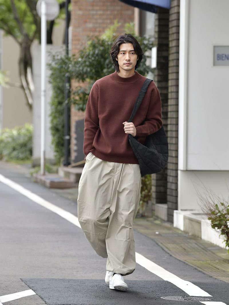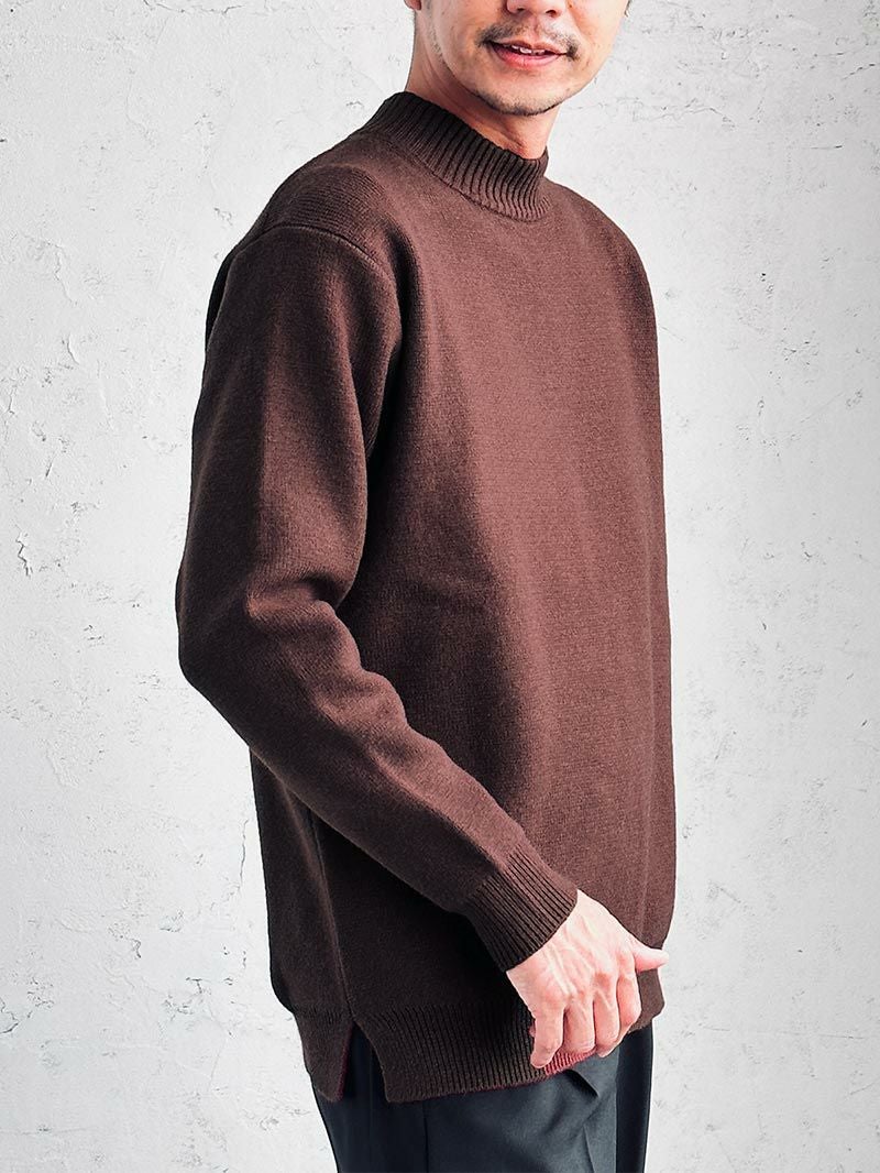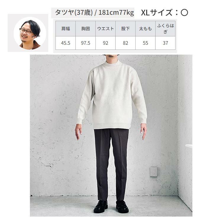 【身長:176cm / 体重:59kg / 購入サイズ:L】ごわつきのある生地の風合いがよかったです。深く落ち着いた色合いです。身幅があってゆったりと着れますが、腕の太さは控えめで上から羽織ってもごわつくことがないかと思います。首元がジャケットとの相性よかったです。