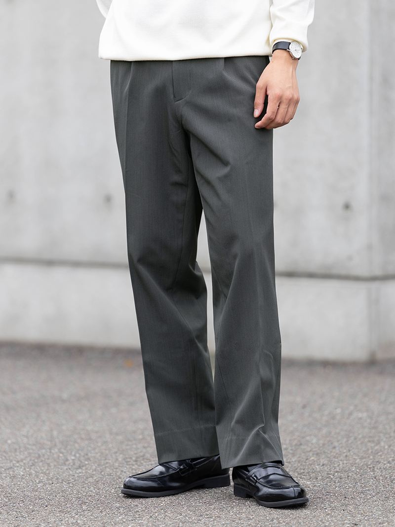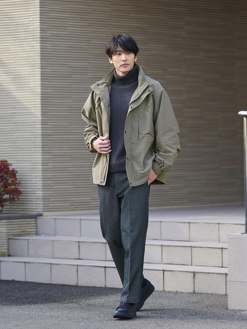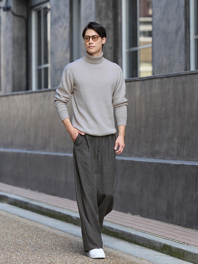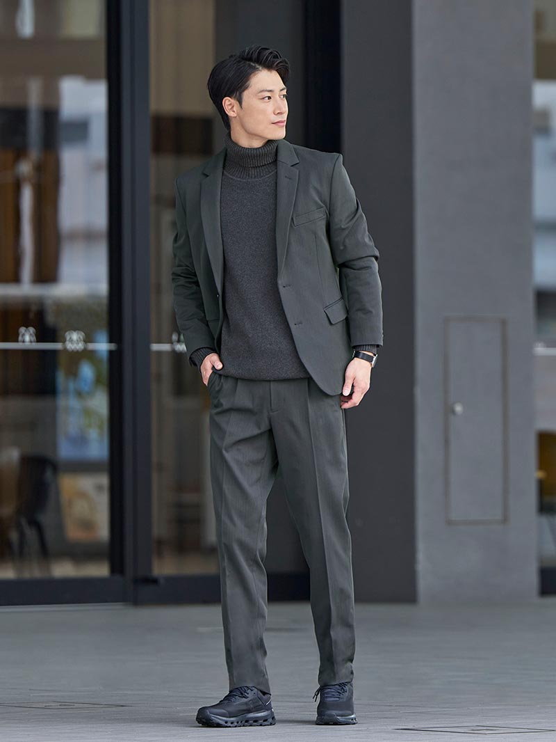 チャコールのセットアップに合わせると、より柔らかな雰囲気がプラスされリラックス感のある印象になり、おすすめです。