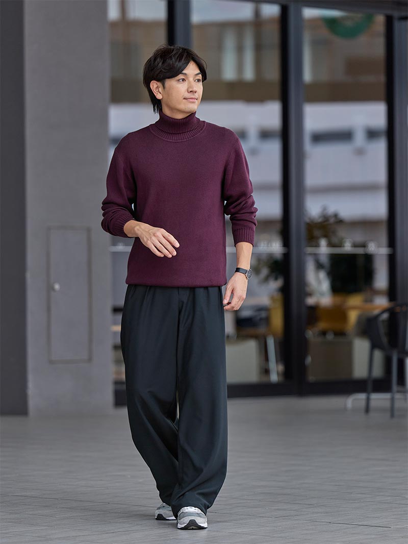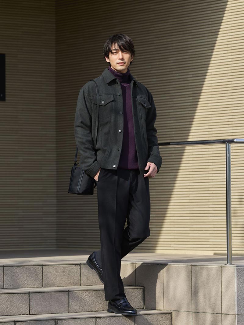 バーガンディー×ブラックの組み合わせは、カッコよさがぐっと引き立つ大人スタイル。