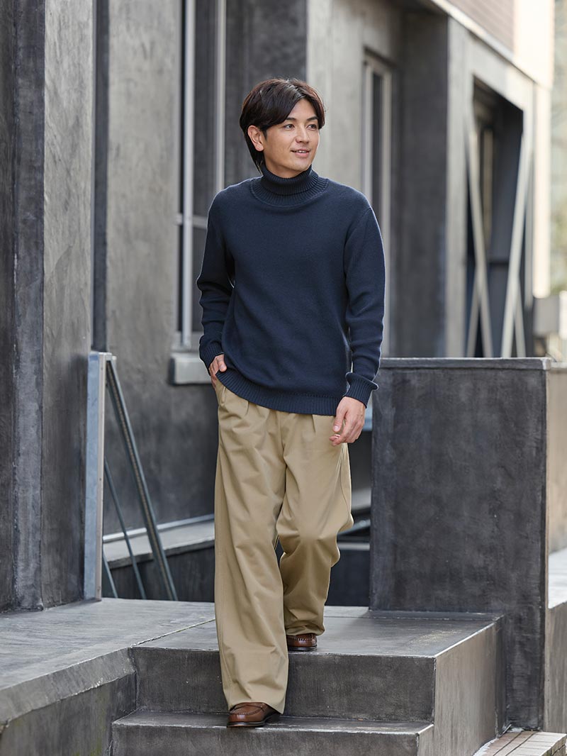 キレイめのチノパンは、大人っぽいワイドラインを選べばオン・オフ着られる優秀アイテムです。