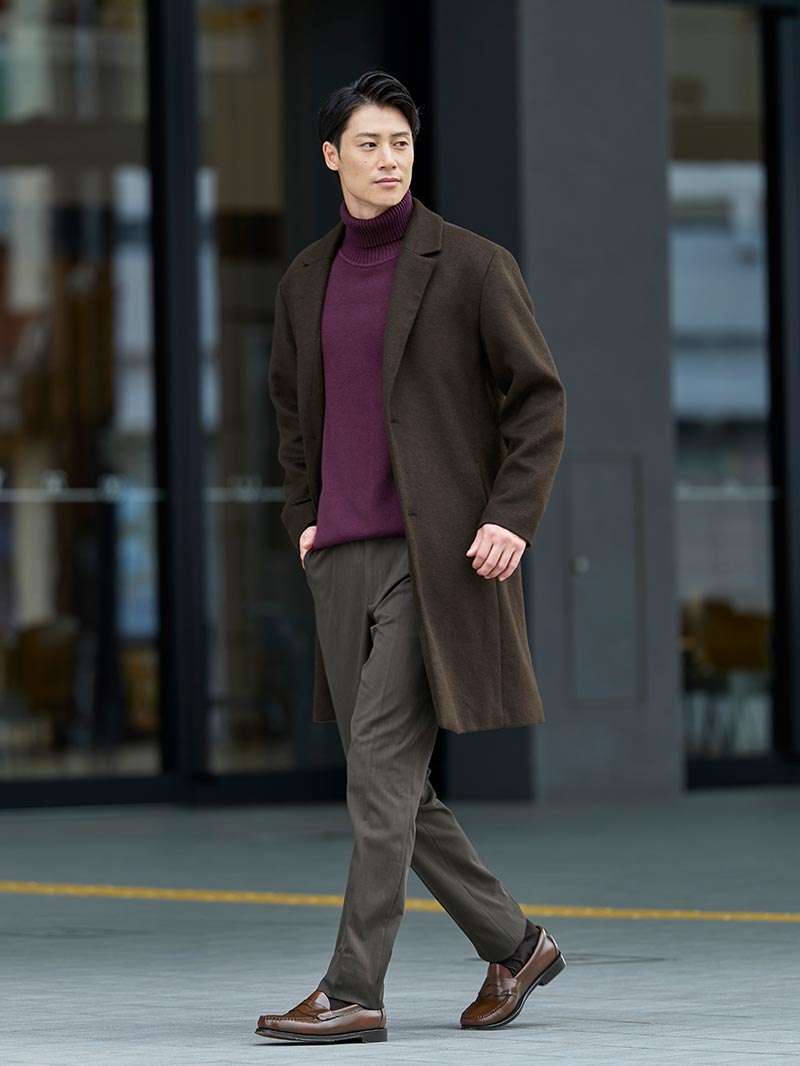 シックなブラウンのコート&パンツを一気に洗練さえてくれるバーガンディカラー。