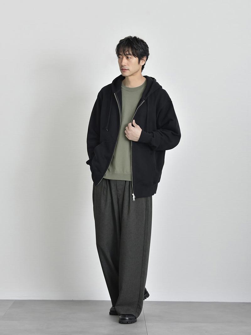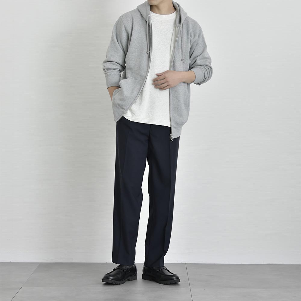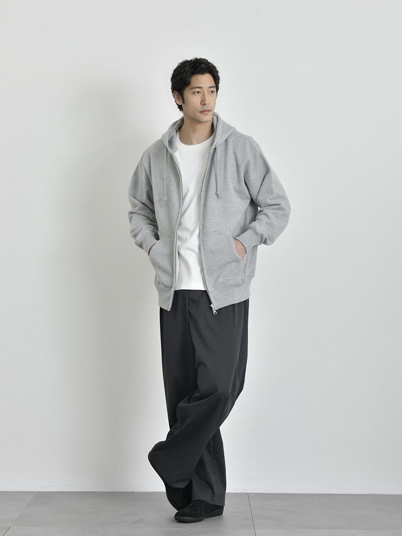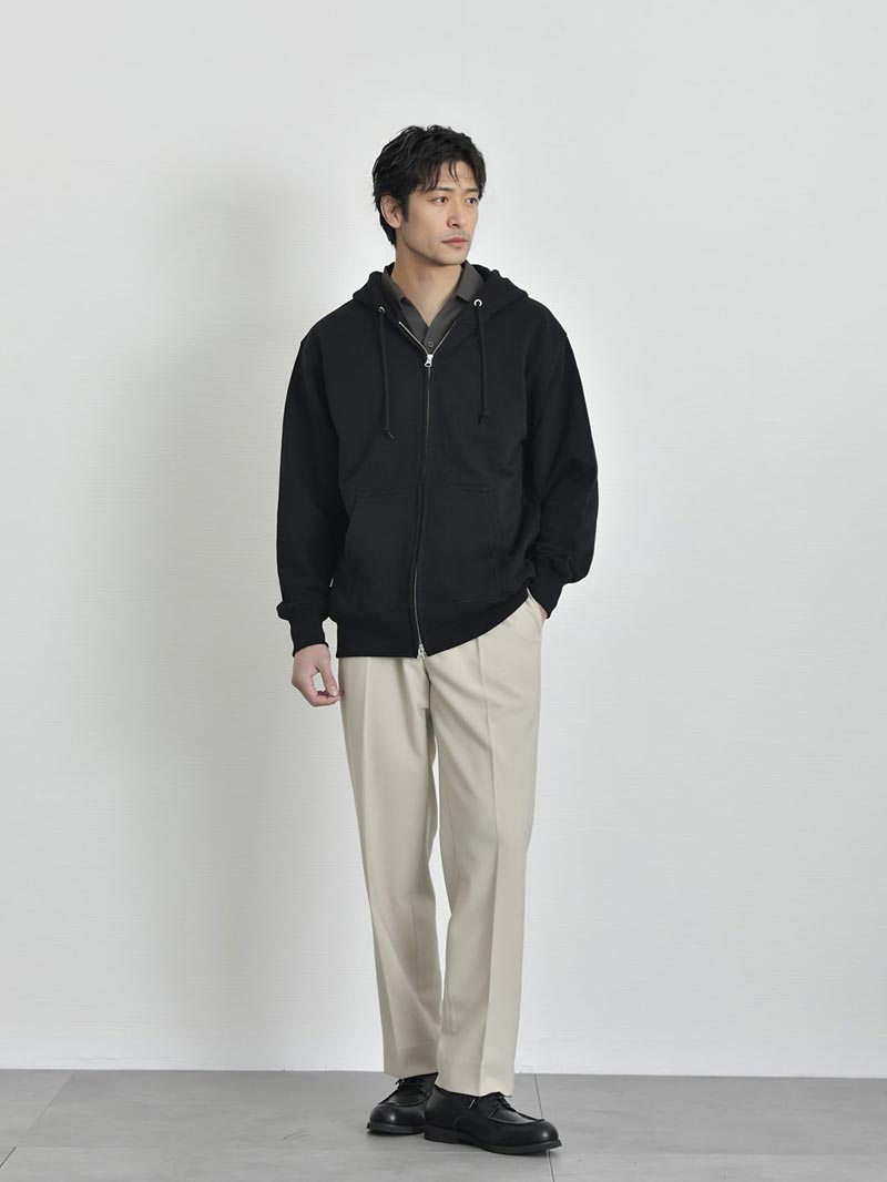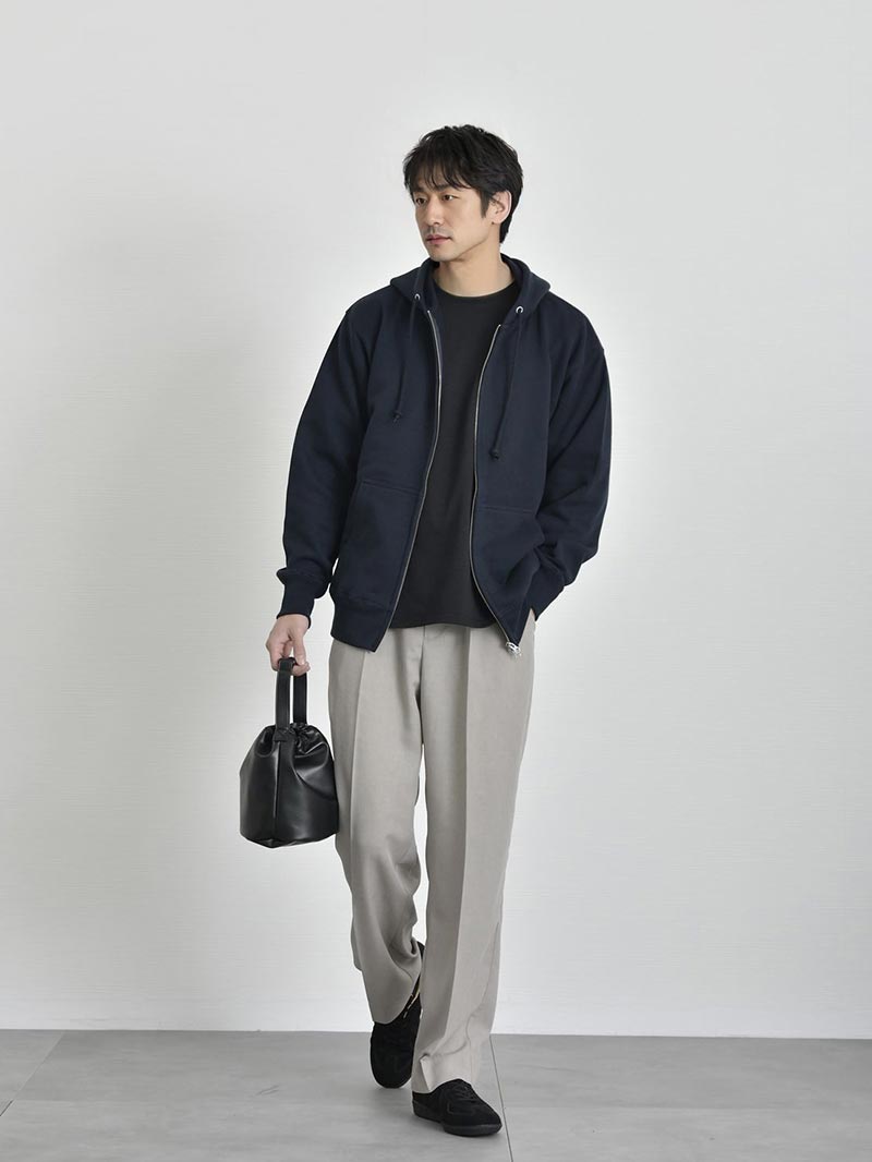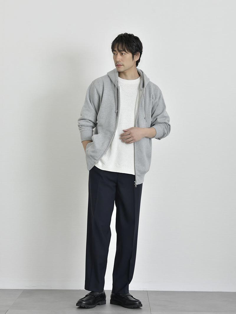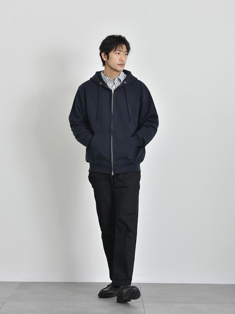 アイテム説明 アーバンテイストでデイリーに着まわしができる、頼もしいジップアップパーカー トレンド感満載の都会的な着こなしが叶う ジップアップパーカー ふっくらとした生地感でリラクシーな着こなしが特徴的なジップアップパーカー。 ダブルファスナーで脱衣と着まわしを兼ね備えたライトアウター感覚で使用できるので、気温の変化が激しい時期にオススメ。1着持っていれば気候の変化や冷房が寒いオフィスでも快適に過ごせます。 もっと見る ヘヴィーに使い回せる丈夫な生地 太番手の縫製糸を採用したヘヴィーでしなやかな裏パイルが魅力で生地感はふっくら。また洗濯後の縮率を軽減させるため、生地水洗いとタンブル乾燥を製造行程で施した「プリシュランクファブリック」を採用。型崩れを気にせずに長く愛用いただけます。 着こなしの幅を広げるダブルジップ仕様 ファスナーはムシ隠しのダブルジップ仕様。ジップの金属部分が見えにくく作られたムシ隠しはきれい見えする重要ポイント程よくカジュアル感を抑えたこなれ感を演出します。 ダブルジップは今季注目のトレンドポイント。上下どちらも開閉できる仕様でレイヤードコーデや程よい抜け感を出したい時に大活躍。 きれい見えするリブ仕様 袖口、裾口はリブ仕様で程よくシルエットが引き締まって見えるので、リラックスしたシルエットでもだらしなくならず、大人の男性にもオススメのパーカーです。 安心の二本針始末 裾口のリブと身頃のシームラインは丈夫なダブルステッチ始末。型崩れを防ぐ丈夫な縫製で安心してデイリーユースしていただけます。 サイズ・素材 肩幅 身幅 袖丈 着丈 S 48 51.5 60 63 M 51 55 60.5 66.5 L 53.5 57.5 61 69.5 XL 56.5 60.5 62 72 ※表記サイズは実寸であり、個体差により誤差が生じる場合があります。 ※商品によっては洗濯タグにヌード寸法が記載されておりますが、実寸とは異なります。 伸縮性 あり ややあり なし 厚み 厚手 普通 薄手 透け感 あり ややあり なし 洗濯 洗濯OK ネット使用 手洗いのみ 表地 綿100% 裏地 なし 生産国 中国 表示を隠す スタッフ試着レビュー サイズにお悩みですか? LINEでサイズ相談する 返品・交換は無料で安心 ご自宅でじっくりご試着いただけます。合わなければ送料負担なく返品できます。あなたにぴったりの一着と出会えるよう、お手伝いいたします。 コーディネート Model : 179㎝/66㎏/ L / ブラック(002)着用 半袖オープンカラーシャツ CHECK CODE4 テーパードパンツ(セットアップ対応) CHECK Uチップシューズ CHECK Model : 179㎝/66㎏/ L / ブラック(002)着用 ルーズシルエットニット CHECK CODE サマーワイドパンツ CHECK チャンキーソールローファー CHECK Model : 179㎝/66㎏/ L / ネイビー(086)着用 ストライプシャツ CHECK ブラックスリムパンツ CHECK チャンキーソールローファー CHECK Model : 179㎝/66㎏/ L / ネイビー(086)着用 ワイドフィットタフTシャツ CHECK CODE サマーストレートパンツ CHECK スウェードレザースニーカー CHECK シンセティックレザーミニショルダーバッグ CHECK Model : 179㎝/66㎏/ L / ネイビー(086)着用 クールタッチスムースTシャツ CHECK ワイドバルーンパンツ(セットアップ対応) CHECK スウェードレザースニーカー CHECK Model : 179㎝/66㎏/ L / ネイビー(086)着用 テクスチャーサマーニット CHECK CODE4 テーパードパンツ(セットアップ対応) CHECK チャンキーソールローファー CHECK スタッフコーディネート もっと見る