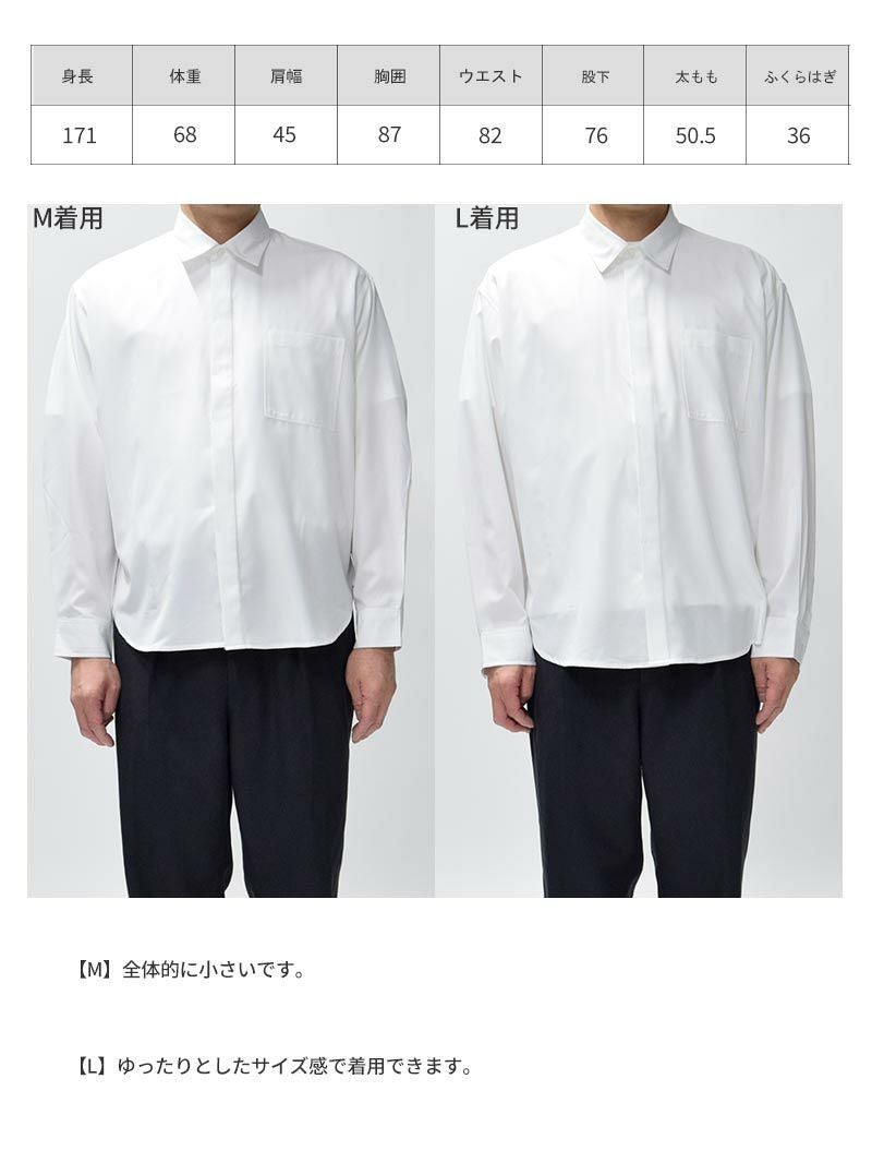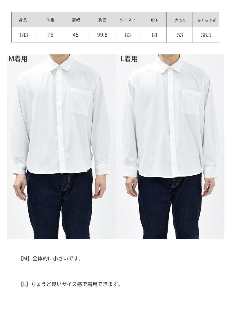 アイテム説明 リラックスシルエットで、イージーケアを形にしたのがタイプライターシャツです。落ち感のあるリラックスシルエットが出したくて生地にはこだわりました。滑らかで上品で触ると気持ちが良い生地です。 ビッグシルエットとは違う独自のアプローチで肩周りや身幅をデザインし、リラックス感のあるシルエットを実現。見た目は比翼のドレスシャツでありながら、スーツケースやバッグにパッキングしてもシワになりにくく、オフィスウェアや旅行に最適です。 リラックスシルエット 落ち感のある生地でリラックスシルエットなのでとても上品でオシャレな印象に仕上げることができました。 もっと見る 上品なワイドパンツコーデに仕上がるシルエット 大人の上品なワイドパンツスタイルにもおすすめのシャツです。 フライフロント仕様 ボタンを隠すフライフロント仕様(比翼)がシンプルながらもエレガント。都会派のミニマルスタイルを求めるあなたにぴったりです。 カラー展開は白と黒の2色 余計な選択肢を省き、白と黒という究極の2色を厳選。ホワイトは爽やかで清潔感を演出し、ブラックは都会的で洗練された印象を与えます。 シワ知らずの上品さと驚きの動きやすさを両立 上品なドレスシャツですが、洗濯後のアイロンが不要なうえ、動きを妨げない柔らかさで、オンもオフもストレスフリーな着用感を提供します。 自宅で洗える、手間いらずの一枚 左:洗濯前/右:洗濯後 自宅で簡単に洗濯できる高機能素材を採用。クリーニング不要で、いつでも清潔な着心地を楽しめます。 LIGHT TECHインナーとは、太陽光・室内灯の近赤外線と、身体から放射される遠赤外線を熱に変える発熱素材を使用した機能性インナーです。 着心地の良い裏起毛によって、より暖かさアップ。 また、ネックラインと袖の長さにこだわり、襟元・袖口からインナーが見えないように設計。 ニット・シャツなど、どんなトップスにも合わせることができます。 好みで選べる2タイプ首元まで暖かいクルーネックシャツと好相性のVネック LIGHT TECH クルーネックインナーTシャツ CHECK LIGHT TECH VネックインナーTシャツ CHECK サイズ・素材 肩幅 身幅 袖丈 着丈 M 50.5 60.5 57.5 76.5 L 55 63.5 58.5 80 ※表記サイズは実寸であり、個体差により誤差が生じる場合があります。 ※商品によっては洗濯タグにヌード寸法が記載されておりますが、実寸とは異なります。 伸縮性 あり ややあり なし 厚み 厚手 普通 薄手 透け感 あり ややあり なし 洗濯 洗濯OK ネット使用 手洗いのみ 表地 ナイロン80% ポリウレタン20% 裏地 なし 生産国 中国 禁止事項 表示を隠す サイズにお悩みですか? AIに適正サイズを聞く 返品・交換は無料で安心 ご自宅でじっくりご試着いただけます。合わなければ送料負担なく返品できます。あなたにぴったりの一着と出会えるよう、お手伝いいたします。 コーディネート Model : 183㎝ / 73㎏ / L / ホワイト着用 ワイドフィットタフTシャツ CHECK CODE テックテーパードパンツ(セットアップ対応) CHECK スウェードレザースニーカー CHECK キャンバス トートバッグ CHECK Model : 179㎝ / 66㎏ / L / ホワイト着用 CODE4 ワイドパンツ(セットアップ対応) CHECK スウェードレザースニーカー CHECK キルトショルダーバッグ CHECK Model : 179㎝ / 66㎏ / L / ホワイト着用 ストレートデニム CHECK Uチップシューズ CHECK ナローリアルレザーベルト CHECK Model : 183㎝ / 73㎏ / L / ブラック着用 クールタッチスムースTシャツ CHECK CODE テックテーパードパンツ(セットアップ対応) CHECK スウェードレザースニーカー CHECK シンセティックレザーミニショルダーバッグ CHECK Model : 179㎝ / 66㎏ / L / ブラック着用 ハイゲージ長袖カットソー CHECK タックワイドデニムパンツ CHECK スウェードレザースニーカー CHECK Model : 179㎝ / 66㎏ / L / ブラック着用 ハイゲージ長袖カットソー CHECK CODE4 テーパードパンツ(セットアップ対応) CHECK Uチップシューズ CHECK ナローリアルレザーベルト CHECK スタッフコーディネート もっと見る