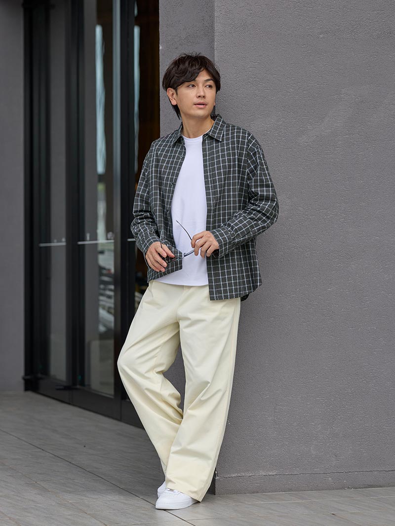 クリーンなホワイトパンツを合わせて、だらしなく見えるのを払拭。ゆったりしたラインのワイドパンツで今っぽさをプラスします。