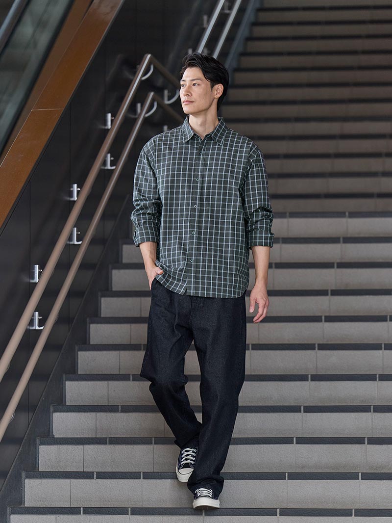 少しゆとりのあるシャツを腕まくりや首元を開けて着ることで、軽い着心地と軽快な印象が演出できます。