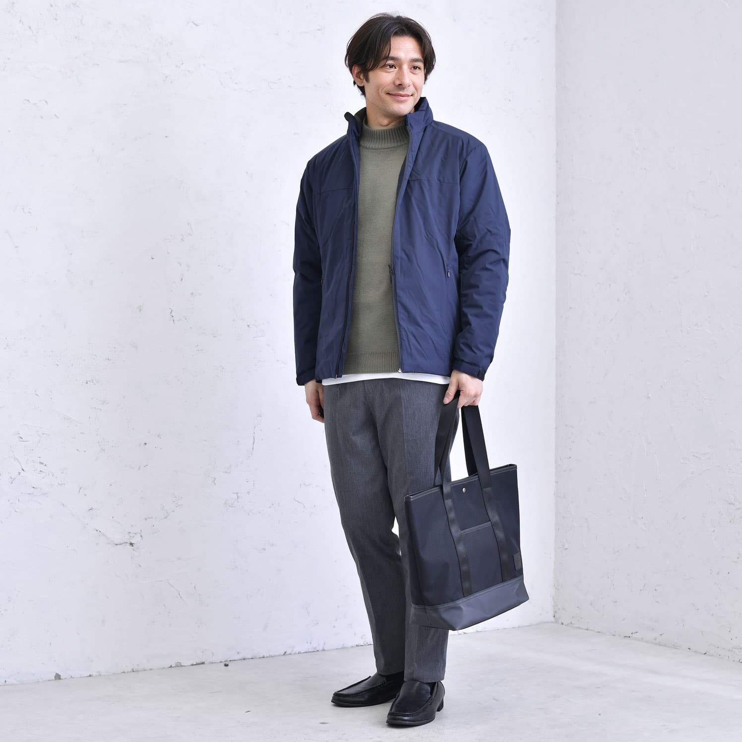 ネイビー×ブラウン×アイボリーの配色が、都会的な印象のコーディネート。