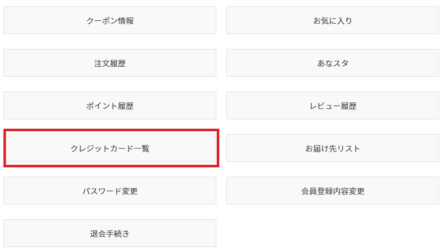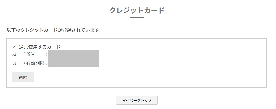 ⑤ご注文後にクレジットカード情報が保存されます。 保存したクレジットカード情報はマイページで確認することができます。 (ログイン後のマイページ画面)