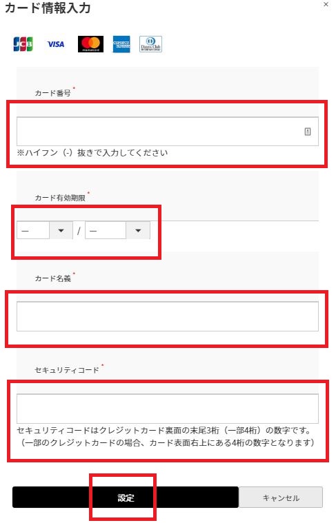 ③「カード情報入力」画面が表示されましたら、以下の情報を入力し最後に「設定」をお願いいたします。