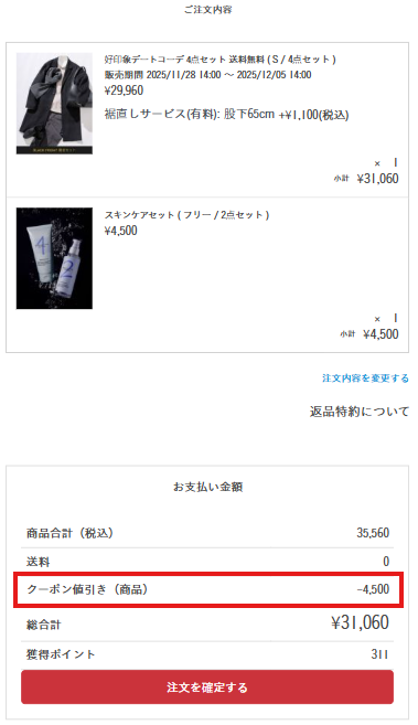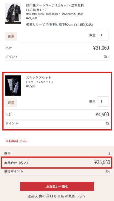 - ブラックフライデー限定セットの交換をご希望の場合は、通常の交換手続きではなく、専用のお問い合わせフォームよりご依頼ください。なおサイズ交換のみ承ります。 交換専用お問い合わせフォームはこちら
