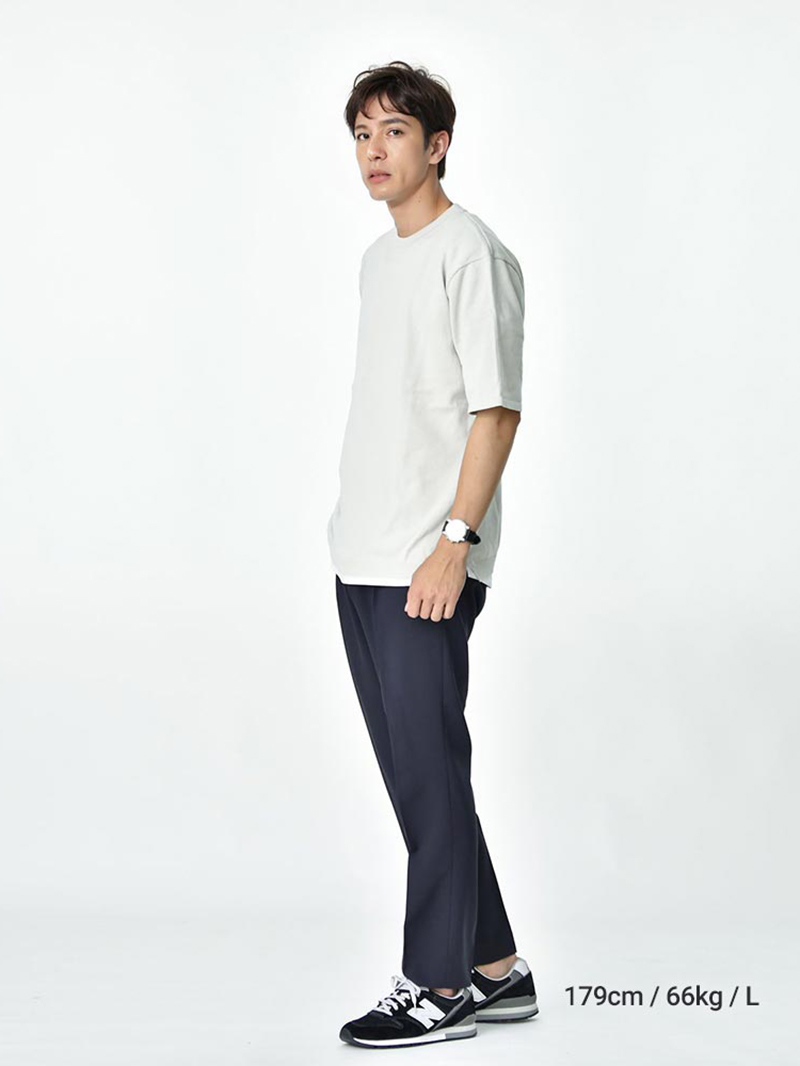 Tシャツに黒のスラックスを合わせた王道カジュアルスタイル。上から薄手のジャケットを1枚サラッと羽織ることで、メリハリのあるカジュアルコーデになります。