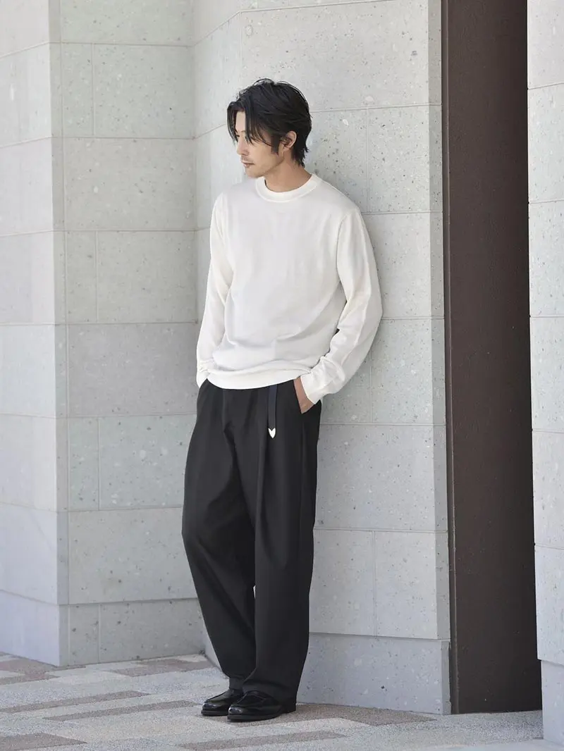 ホワイトのニットとシンプルなスラックスを合わせた、清潔感のある着こなし。シンプルながらもこなれ感のあるスタイルで、オンオフ問わず使いやすいコーデです。