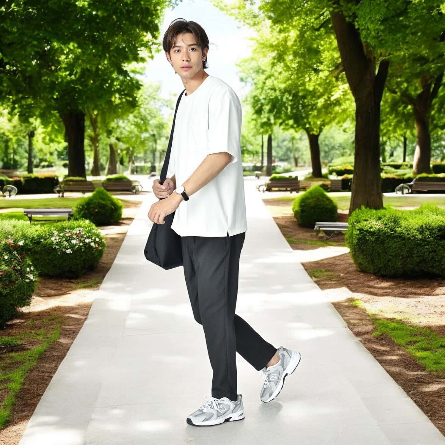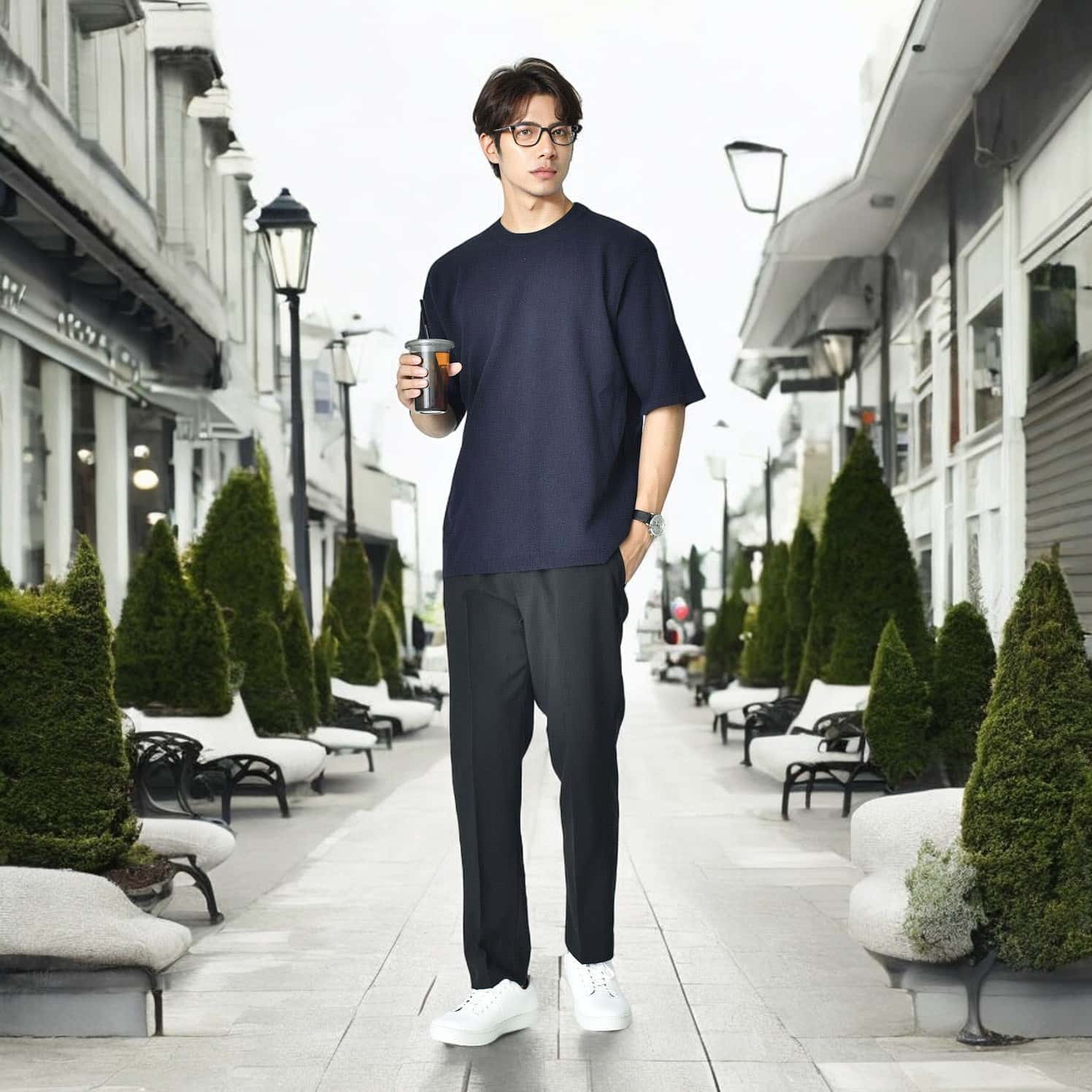 アクティブなデートでは、動きやすいTシャツコーデがおすすめ!さらにダークカラーは汗ジミなども目立たず安心。