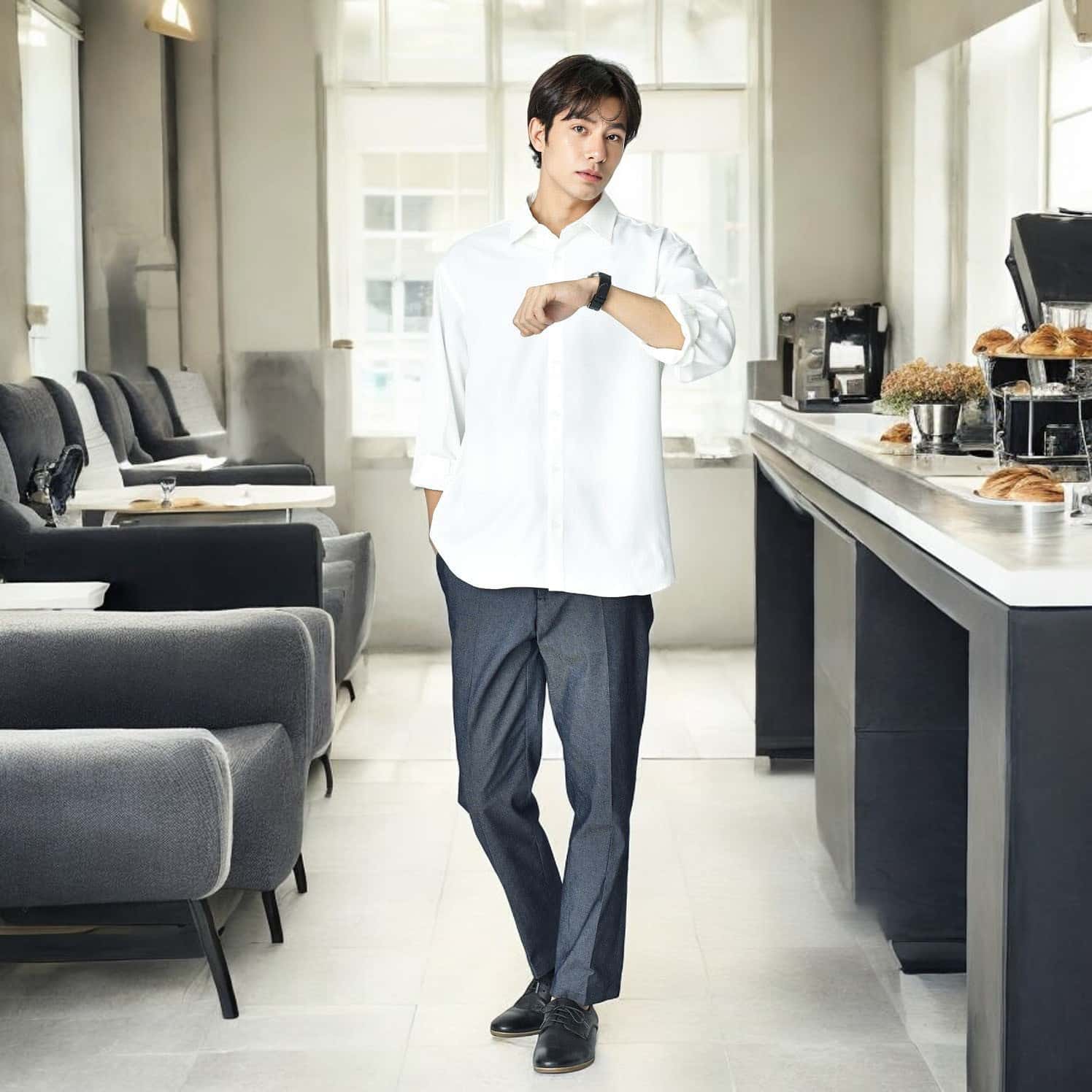 まとまりのあるセットアップスタイル。カジュアルな要素を取り入れることで、親しみやすくラフな印象に。