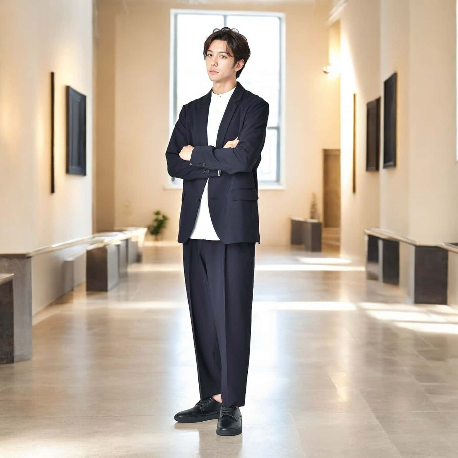 ネイビーのセットアップで統一感を持たせ、ブラックのレザースニーカーで程よいカジュアルさをプラス。