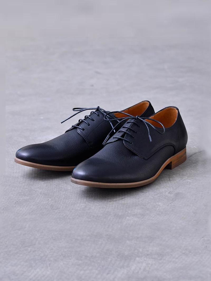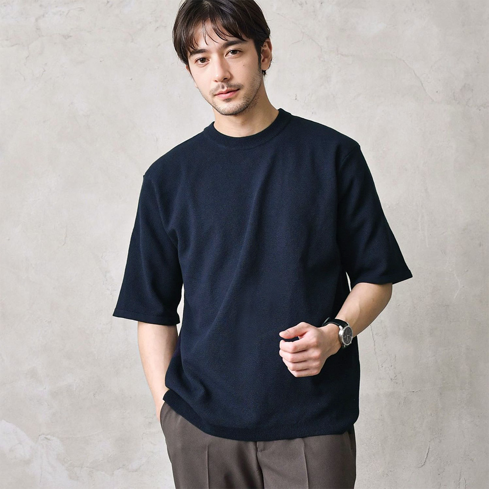 ネイビーとホワイトで軽やかさを演出。ブラックの革靴でより洗練された印象に。