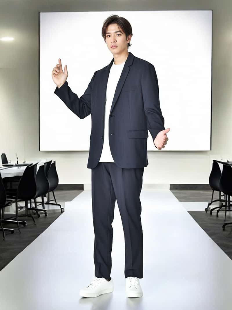 ネイビーのセットアップとグレーの色合わせで上品さと信頼感を演出。