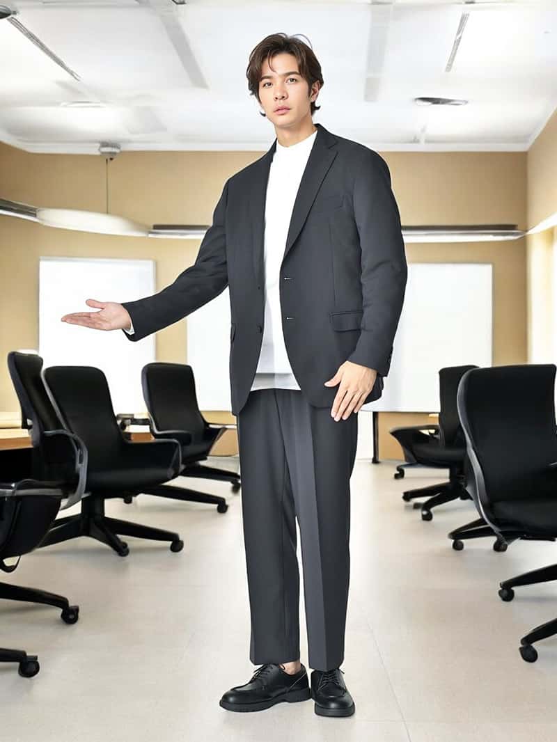 表面感に表情があるセットアップでキメすぎない着こなしに。タックインで誠実さを引き立て。