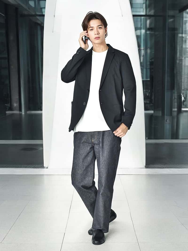 同素材のセットアップで統一感を。全体をモノトーンでそろえて、カジュアルになりすぎないよう調整。