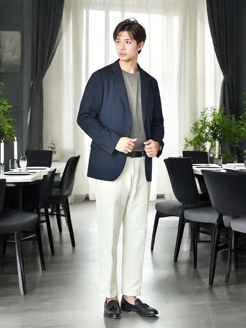 仕事関係でのお食事会では「きちんと感」が大切。ネイビーのジャケットで誠実な印象をあたえ、白のボトムスで爽やかに。