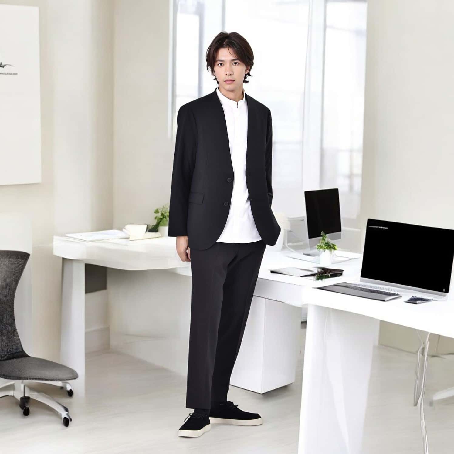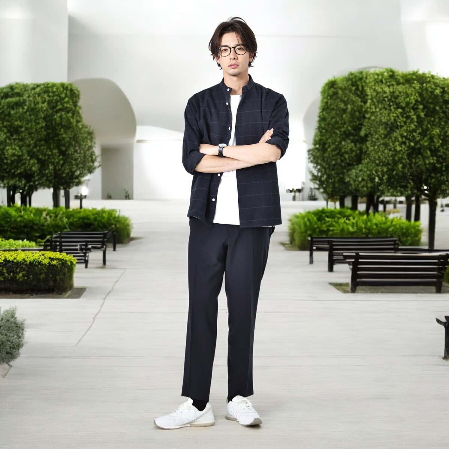 ノーカラージャケットとバンドカラーで首元スッキリなコーディネート。残暑の中でも見た目はスッキリスマートに。