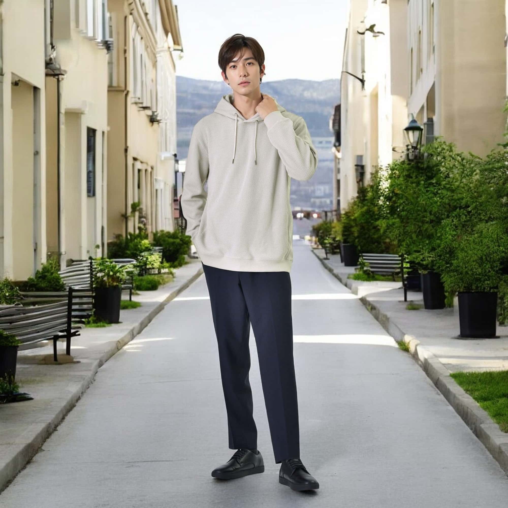 ワッフルパーカーとテーパードパンツの組み合わせが絶妙なバランスで、程よくリラックス感がありつつもスタイリッシュに。