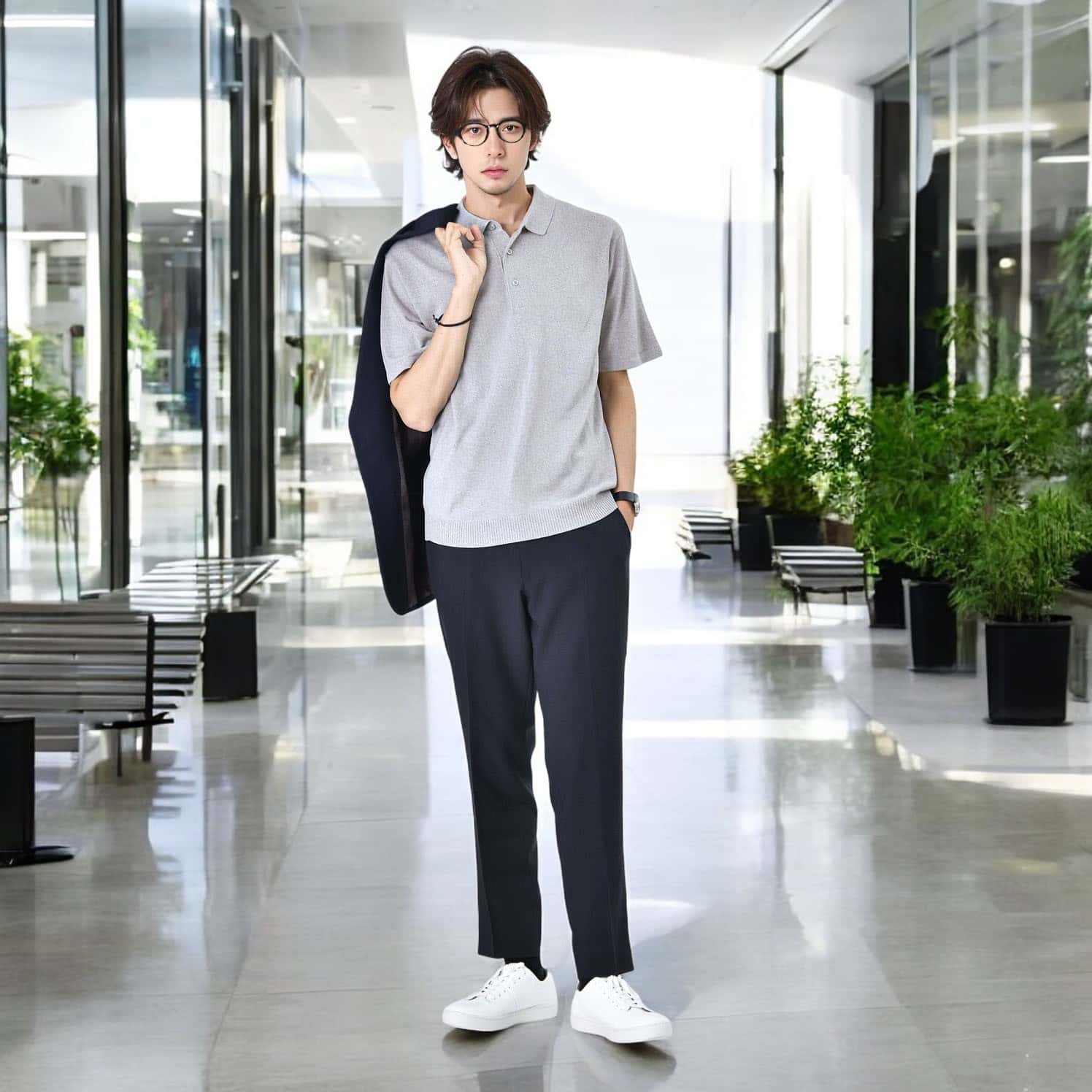 テーラードジャケットのキレイめスタイルには、ポロシャツで柔らかさをプラスすれば、余裕のある大人な雰囲気に。