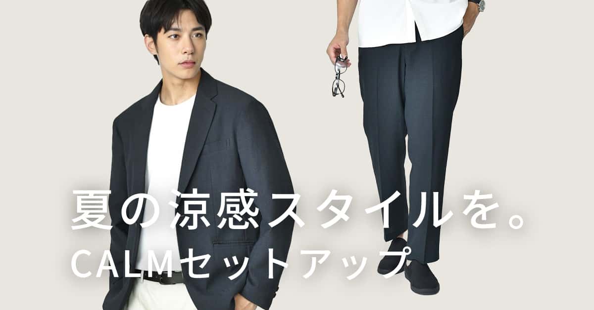 洗練されたデザインと通気性の良い素材が組み合わさり、ビジネスシーンでもカジュアルなシーンでも快適さとスタイルを両立するCALMセットアップをご紹介。