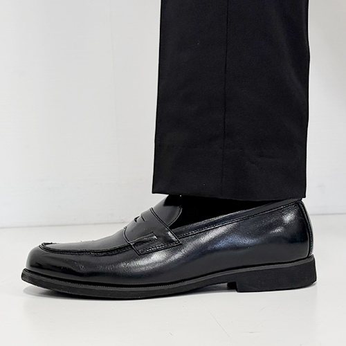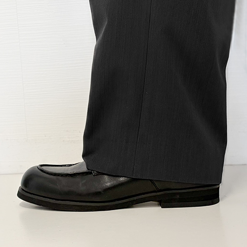 スラックスの裾のクッション(たるみ)によって印象が変わります。