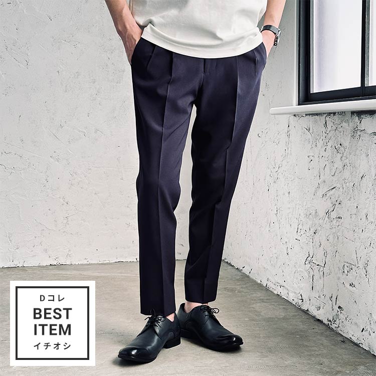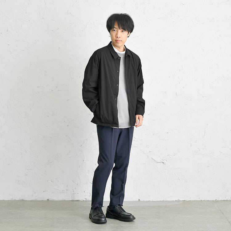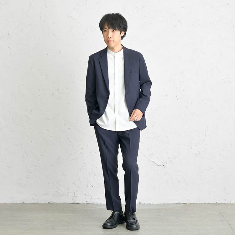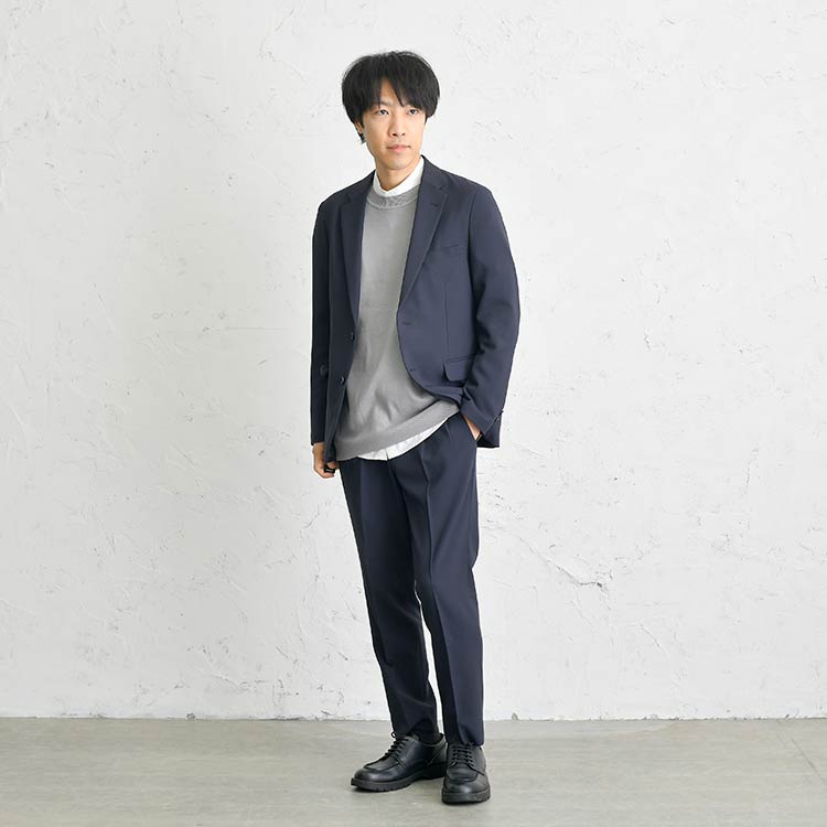 テーパードパンツにこの専用ジャケットを合わせるだけで、まずセットアップコーデを組むことができます。直線タイプさんが得意な、凛々しさを感じさせるネイビーを使って、クールな雰囲気に仕上げてみてくださいね!