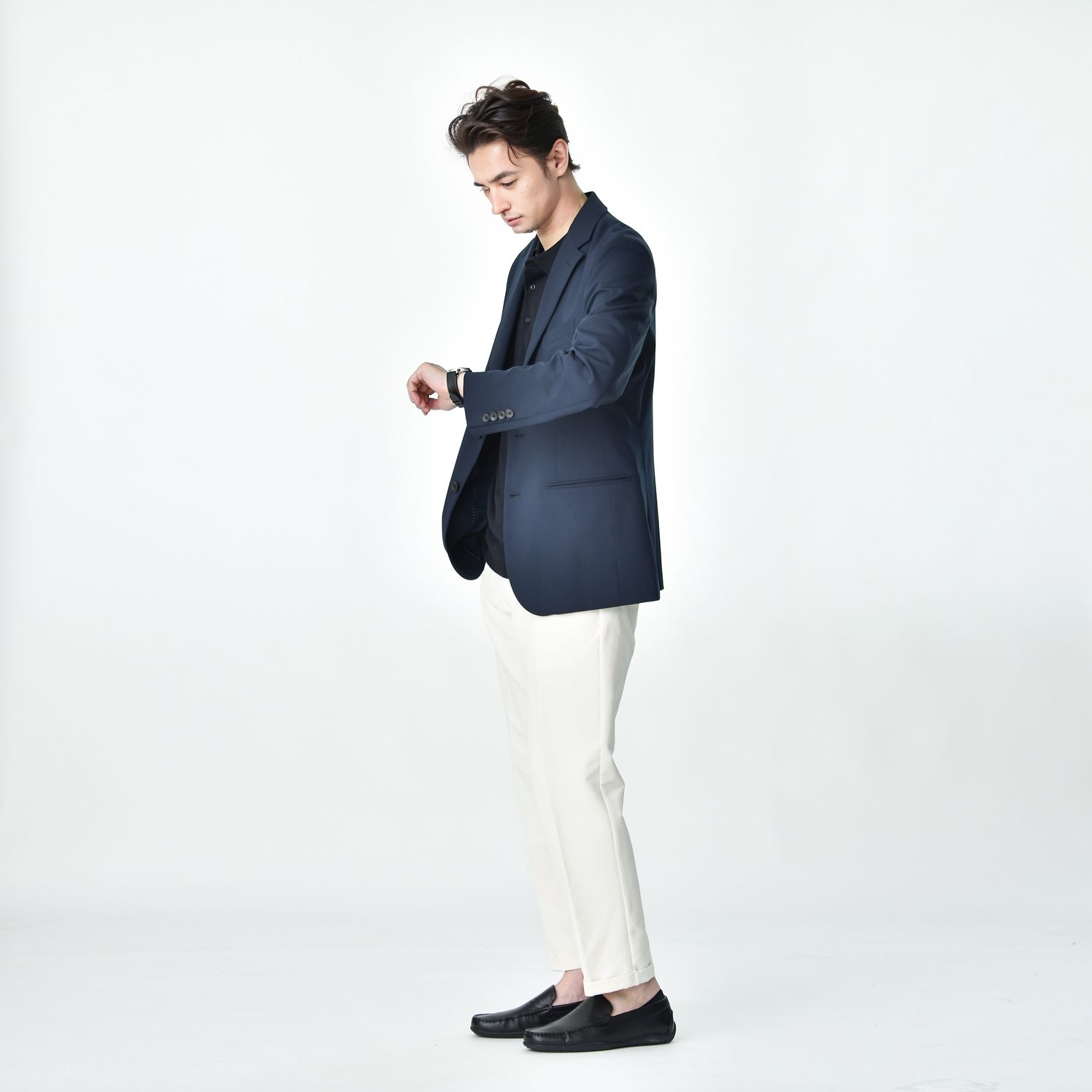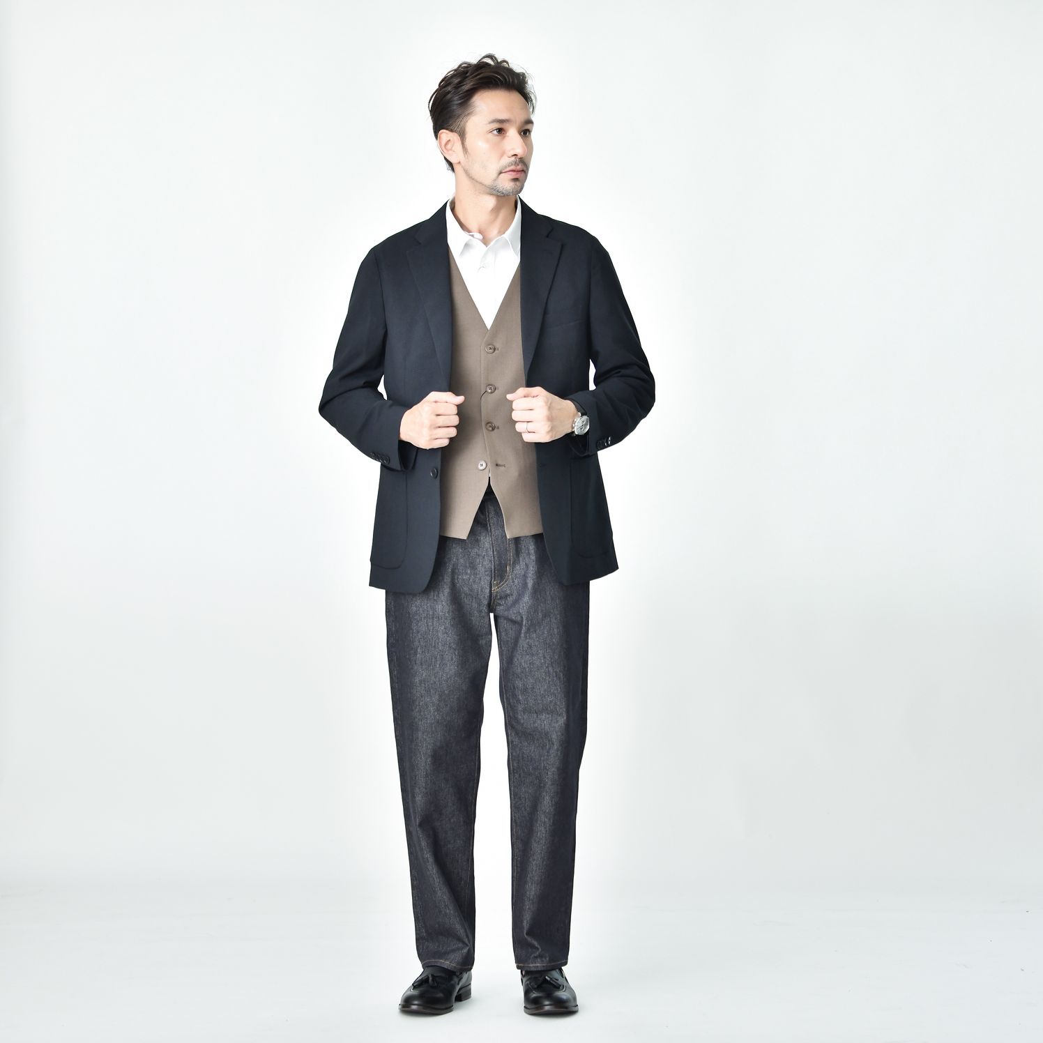 スリムフィットのパンツは、ジャケットとのバランスが取りやすく、スタイリッシュな印象を与えます。