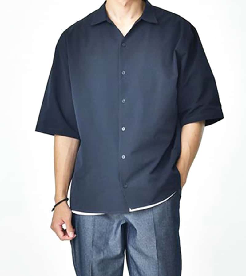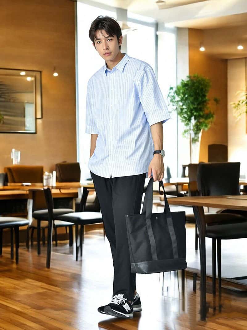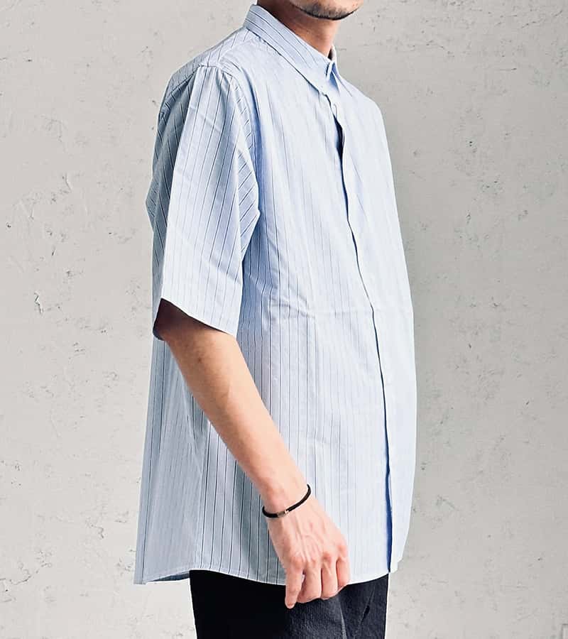 爽やかさを取り入れたいときはブルー×ストライプのシャツが鉄板。ラインが細いおかげでカジュアルになりすぎないところも取り入れやすさのひとつです。ゆったりめなシルエットなので動きやすさもバッチリ◎