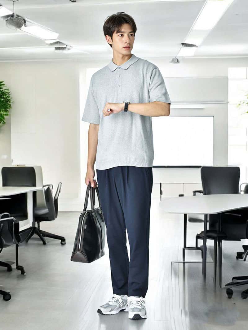 大事な会議の日はとにかく好印象コーデを意識。オフィカジアイテムとして定着してきているポロシャツで清潔感+上品さをグッと引き上げましょう。