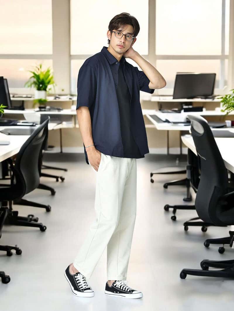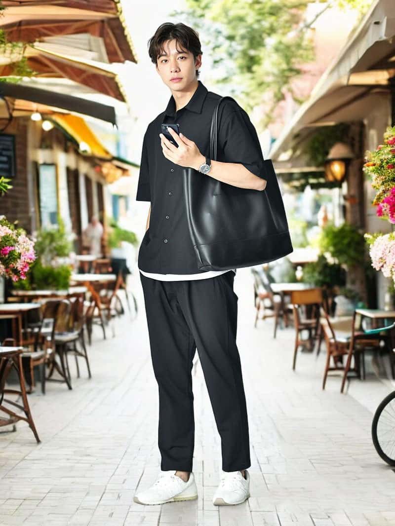 オフィカジスタイルも、気持ちキレイめ寄りを意識するのが無難。第一印象に大切な清潔感はホワイトのTシャツでカバーし、ブラックのセットアップでコーデ全体を引き締めましょう。