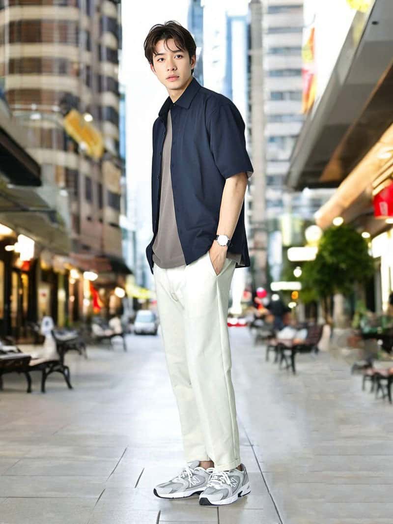 大切な人とのデートには、親しみやすく、かつキメすぎない大人カジュアルスタイルがベスト。清潔な印象を与えるシャツをメインに、アイボリーのパンツをコーデに加えて。腕時計などの小物をつかったアクセント付けもわすれずに。