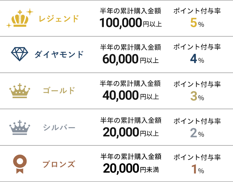 会員ランクは初回購入日から半年ごとの累計購入金額で決定され、ランクごとにお買い物の際に付与されるポイントの付与率が変化します。