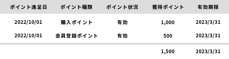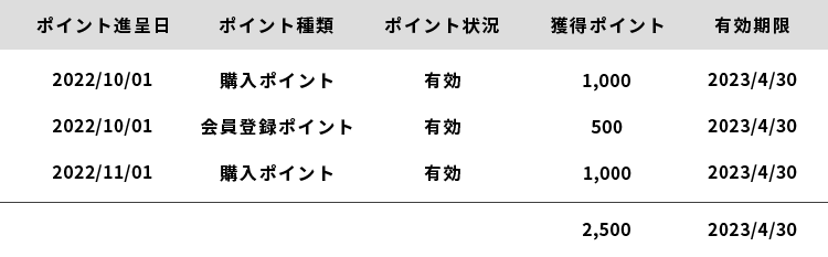 上の例に続き、2022/11/1に商品を購入し、新たにポイントが進呈された場合