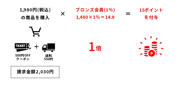 1,980円(税込)の商品を、500円OFFクーポンを併用して購入した場合(ただし、送料が550円発生します)